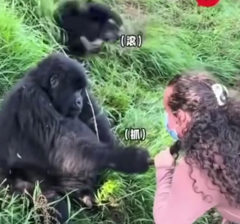 动物园里面,一只黑色的公猩猩看女游客在对着它拍照,一把抓住女游客的头发,把女游客