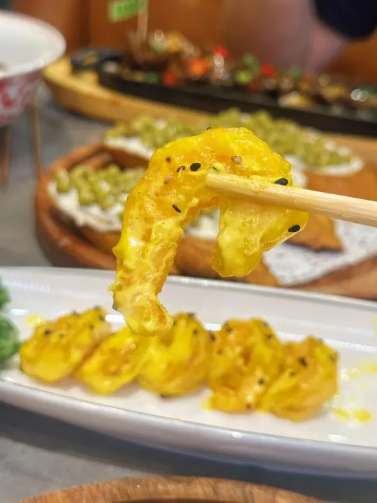 ✅芥末虾球也值得一试,酥脆外衣包裹鲜嫩虾肉,芥末的微冲反而更提鲜甜