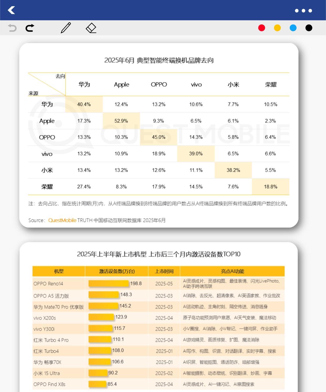 苹果虽然猛,但还是比不过华为啊...... 看最新的2025中国智能手机市场洞察报告,截止6月国内活跃的智能手机数量还是华为领先啊,苹果都赶不上,用华为手机的人是真多 第三则是OPPO,还是不含一加和真我的,也是挺猛的,前三加起来超过50%了,之前还没想过用OPPO的也这么多 而且OPPO用户换手机还大都继续用OPPO的,品牌忠诚度仅次于苹果,上半年开售后3个月激活量最大的还是OPPO Reno14,这不声不响的OPPO在默默恰大的啊 不过光看设备数是一回事,苹果的机型都是大几千的高端旗舰的,能排到第二已经很夸张了,这块国产品牌还有得追了,大家觉得呢?