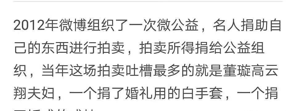 都说张唯伊抠门,其实高云翔也大方不到哪里去。 董璇早年曾发微博“吐槽”前夫节俭,五个人一起聚餐就点了几个开胃凉菜,还是董璇后来加了羊肉串、铁锅鱼、招牌虾等几道硬菜。 董璇当时特意发微博,明显不是在指责高以翔,似乎是在暗自夸赞对方可爱,语气里都是满满的爱意。 2012年有一场明星公益活动,明星拍卖自己的物件,把拿到的钱用来做公益。 董璇和高云翔抱着“节俭”理念,捐赠了婚礼上用的白手套,还有配送的戒枕,当时两人就引起了不少非议。 所以没有必要过多替董璇抱屈,可能她本人真的喜欢这种会过日子,勤俭持家的男人,只能说每个人的择偶眼光都不同,虽然有点难以理解,但尊重和祝福就好。