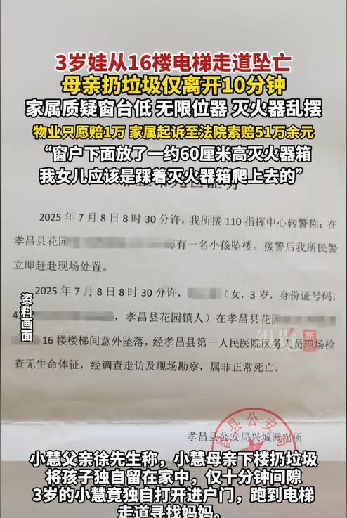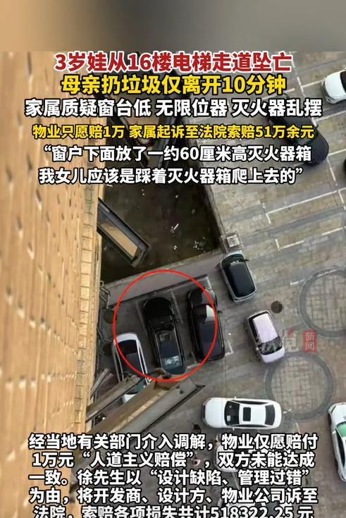 湖北孝昌,一3岁女童在监护人下楼扔垃圾时跑出家门,然后从16楼电梯走道处爬上窗户坠亡。女童的监护人认为是电梯走道的窗户未达到安全高度,灭火器设施放置不对等,所以他们要求开发商和物业公司赔偿。物业公司只同意人道主义补偿1万元,但却被女童监护人认为冷血,之后他们便将开发商和物业公司告上法院,索赔共计51.8万余元。 2025 年 7 月 8 日清晨,3 岁的小慧(化名)像往常一样,在家中咿咿呀呀地玩耍,对周围的一切都充满好奇。她的妈妈想着就下楼扔个垃圾,很快就回来,便叮嘱了小慧几句,转身出了门。谁也没想到,就是这短短十分钟,成了这个家庭永远的痛! 小慧的妈妈下楼后,活泼好动的小慧没一会儿就觉得无聊了,她想去找妈妈。小小的她,凭着对妈妈的想念,独自打开了家门,跌跌撞撞地跑到了电梯走道。16 楼的电梯走道,视野开阔,能看到楼下的车来车往。 走道的窗户下方,放着一个约 60 厘米高的灭火器箱,这对于好奇又想 探索的小慧来说,像是一个小台阶。她或许是想顺着灭火器箱爬上去,看看妈妈是不是就在楼下,可就在她攀爬的过程中,意外发生了,小慧从 16 楼坠落。 当小慧的妈妈扔完垃圾,哼着小曲儿回到家,却发现家里空空荡荡,小慧不见了。她瞬间慌了神,疯了似的在楼道里呼喊、寻找。很快,楼下传来的消息让她如坠冰窟,小慧坠楼了! 经孝昌县第一人民医院医务人员现场检查,小慧已无生命体征。经调查走访及现场勘察,小慧属于非正常死亡。 突如其来的噩耗,让小慧的家人陷入巨大的悲痛之中。小慧的父亲徐先生(化名)怎么也无法接受,前一刻还活泼可爱的女儿,就这样没了。他开始仔细查看事发的电梯走道,越看越觉得小区存在诸多安全隐患。 他认为,窗户未达到安全高度,而且没有限位器,再加上灭火器箱乱摆,才导致小慧能轻易爬上去发生意外。 徐先生找到了小区物业,希望能讨一个说法。然而,物业方面的态度却让他更加心寒。经过当地有关部门介入调解,物业仅愿意赔付 1 万元的人道主义赔偿。 在徐先生看来,这 1 万元对于失去女儿的家庭来说,无比冷血,完全无法弥补他们的伤痛,也没有正视小区存在的安全问题。 于是,徐先生以设计缺陷、管理过错为由,将开发商、设计方、物业公司一同诉至法院,索赔各项损失共计 518322.25 元。 这场官司,承载着一个家庭对逝去女儿的思念,也寄托着他们对安全居住环境的诉求。案件将于 9 月 3 日在孝昌县人民法院开庭审理,届时,各方将在法庭上阐述自己的观点,等待法律的裁决。 此事在网上传开后,引发了网友们的热烈讨论。有网友说:“三岁的孩子正是调皮的时候,家长确实不能掉以轻心,哪怕一分钟都可能出意外。但物业和开发商也有责任啊,安全设施不到位,就该负责。” 也有网友表示:“这事儿太让人痛心了,希望能有一个公正的判决,给孩子家人一个交代,也能给其他小区提个醒,重视安全问题。孩子的安全真的是天大的事,无论是家长还是物业,都得把安全放在第一位,别等出了事才后悔。” 对此你怎么看?欢迎大家在评论区留言讨论。 信源:纵览新闻 发布于2025年8月26日