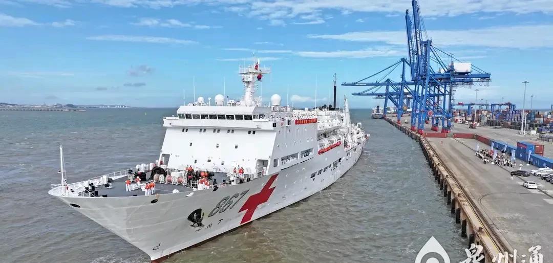 喜迎共建,解放军海军丝路方舟医院船停靠泉州港,受到当地的民众热烈欢迎,开展军民共