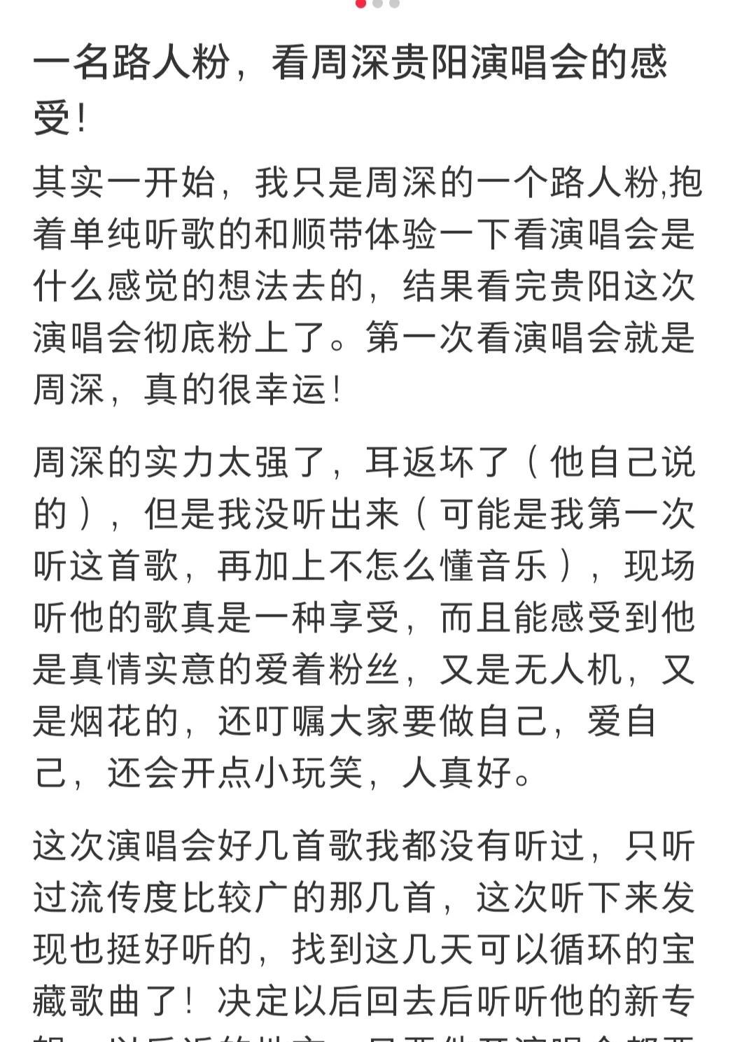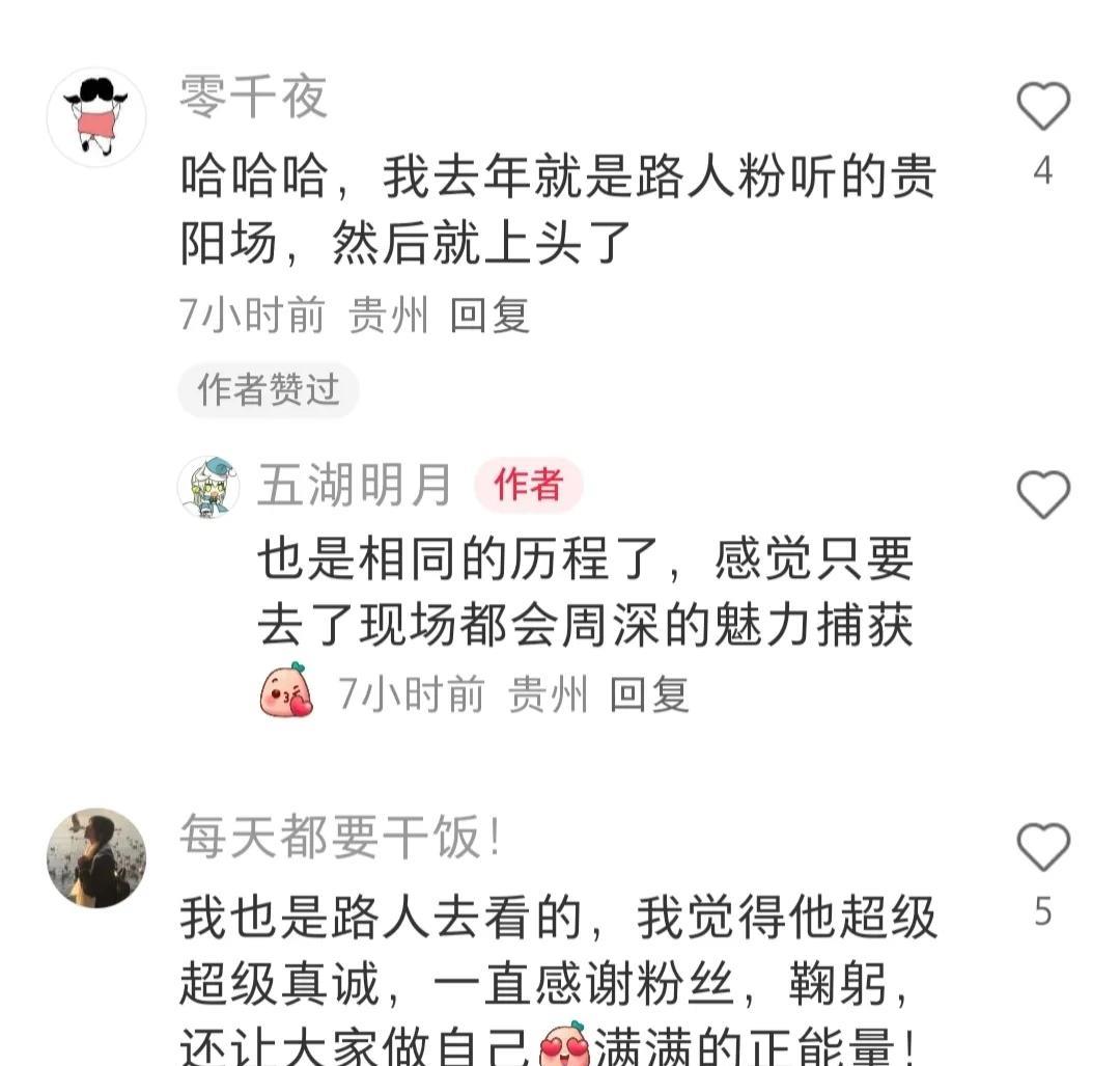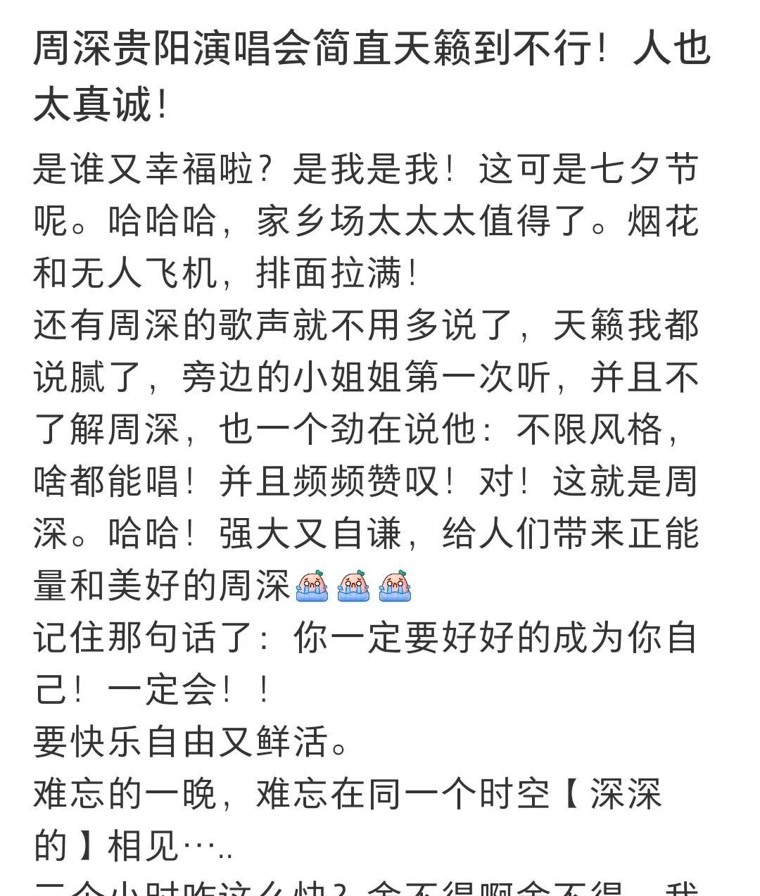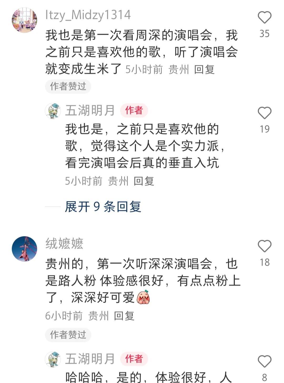 哦豁!天津场又售罄了! 周深的演唱会门票是越来越难抢咯!火火火[鼓掌][鼓掌][鼓掌] 很正常,太多太多路人看过一次周深的演唱会就入坑的![呲牙] 路人:我也是陪女儿来,然后喜欢听了,都是正能量满满的! 路人:我也是路人去看的,我觉得他超级超级真诚,一直感谢粉丝,鞠躬,还让大家做自己,满满的正能量! 真诚是永远的必杀技!就算是路人,也会感觉到的! #周深#