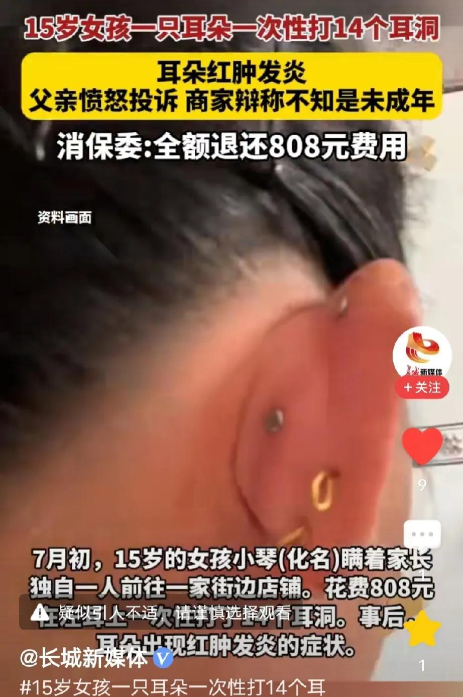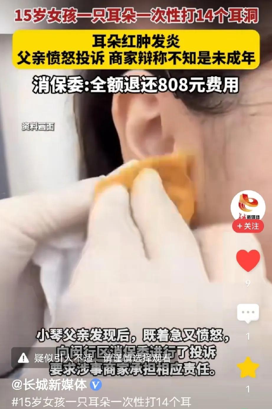 上海,15岁女孩瞒着父母在街边打耳洞,光左耳就打了14个,次日,她的耳朵又红又肿