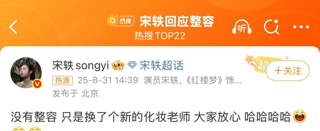 宋轶疑似整容?本人火速辟谣! 宋轶今天参加活动,被质疑整个人大变脸,甚至有了一丝网红的气味。说实话看一些截图真的会觉得宋轶跟一个网红撞脸了,不知道的还以为那个网红给她当替身来参加活动了。还好她本人火速出来辟谣称自己只是换了一个化妆师,并没有整容。要不然,咱再把以前的化妆师请回来吧!