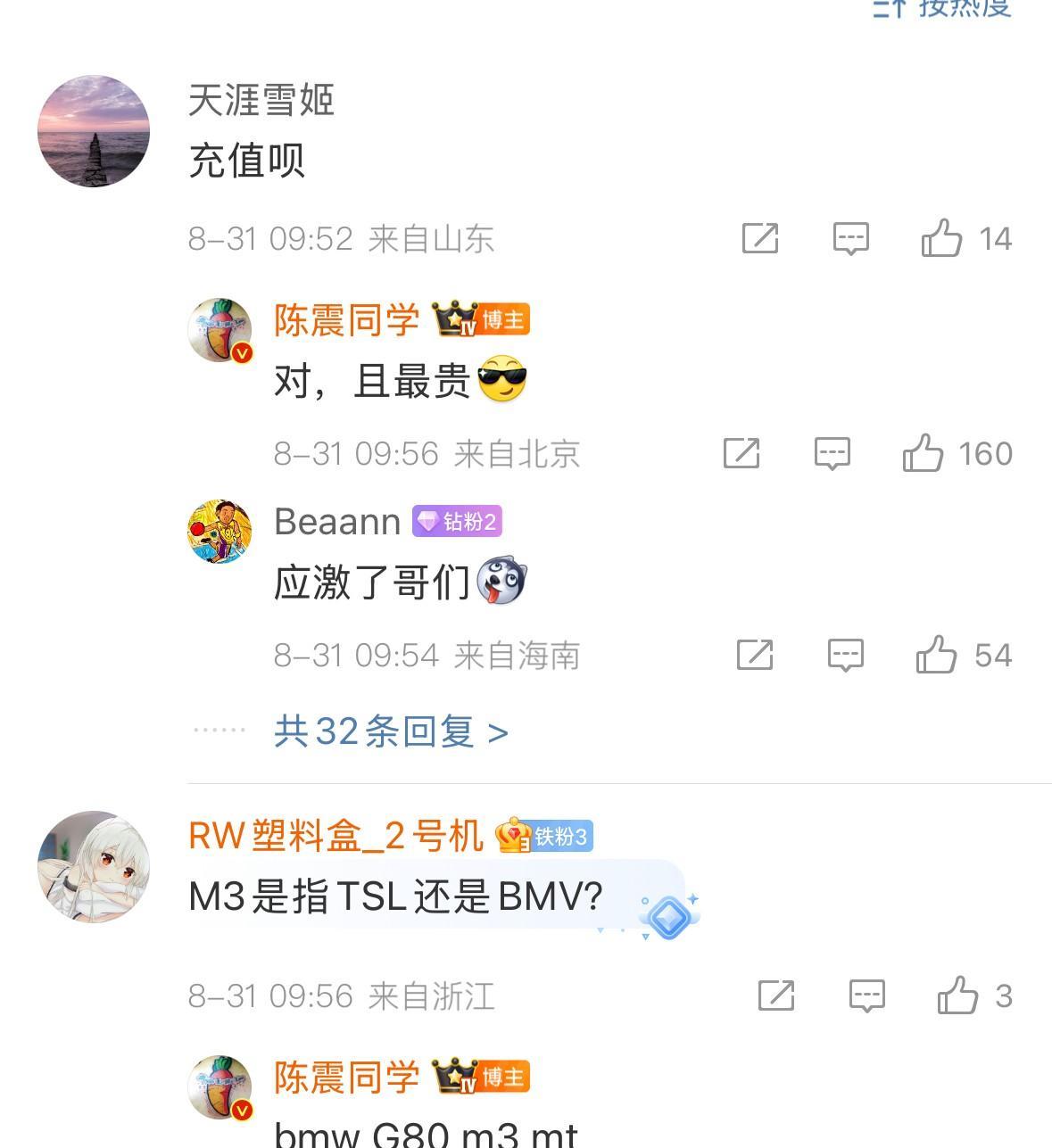 陈震称尊界S800后排放自行车很轻松,网友称其充值,陈震回复到:对,且最贵。 说