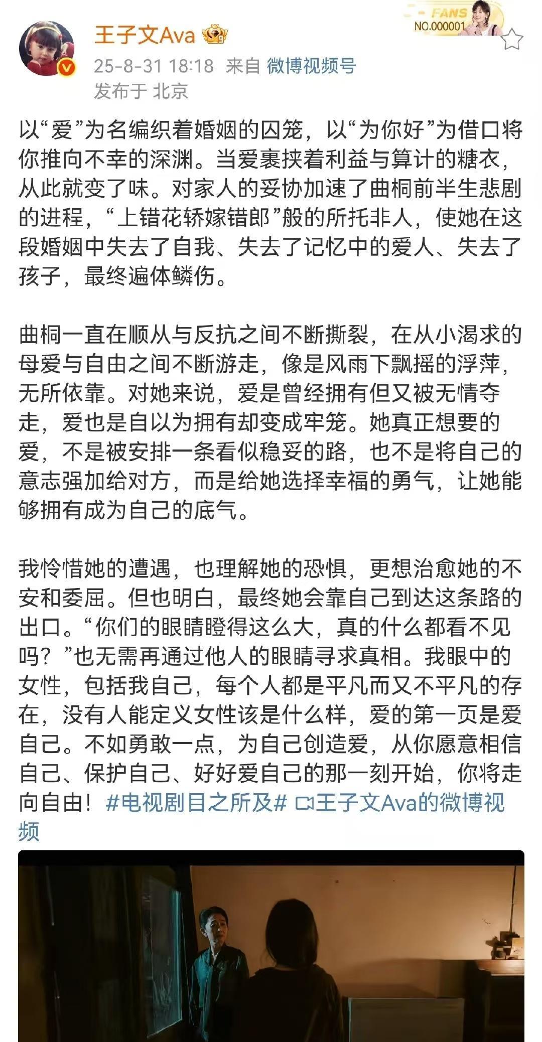 王子文被低估的中女内核太牛了! 8月31号,王子文亲自发表长文写下她对曲桐这个角