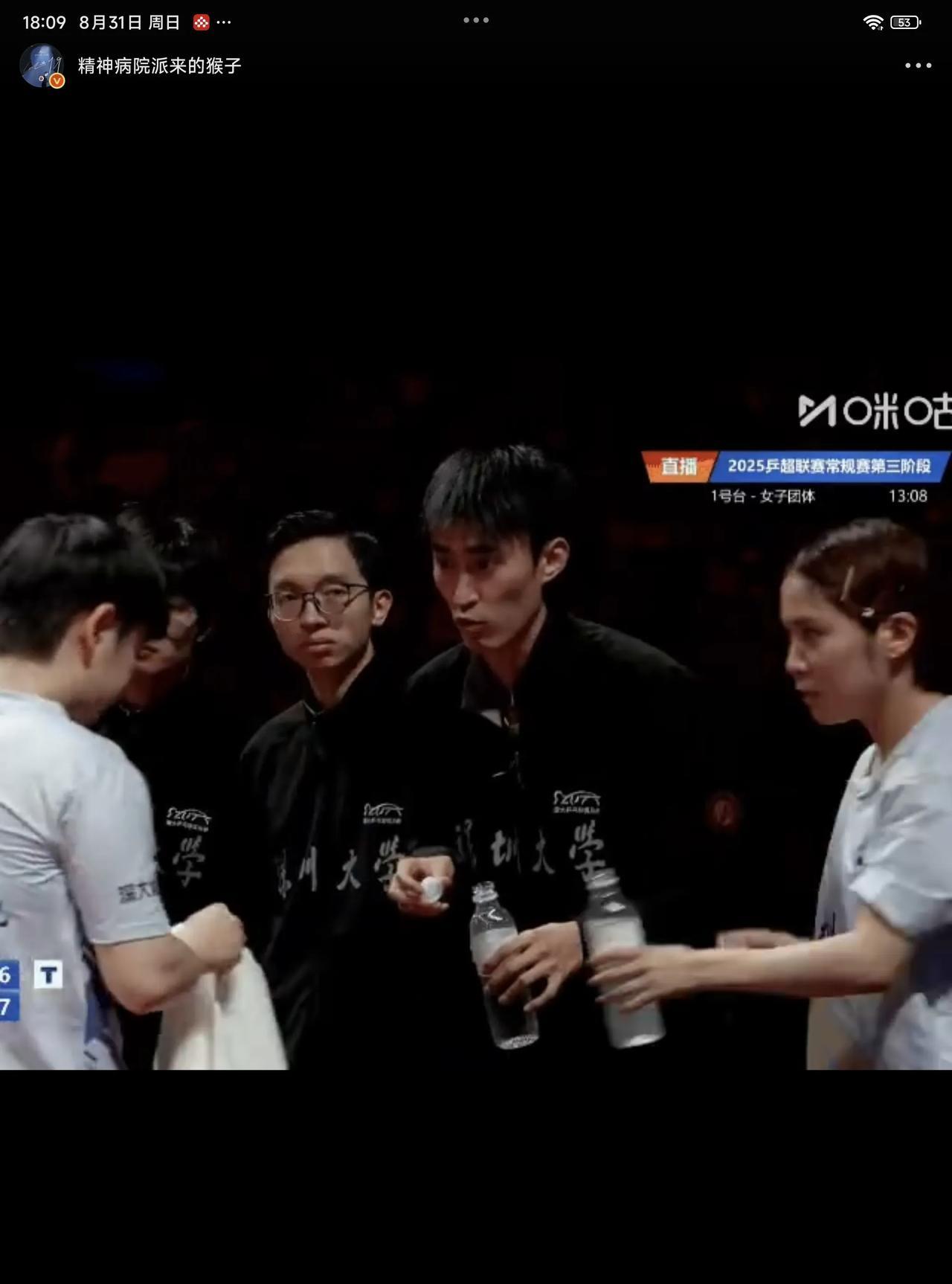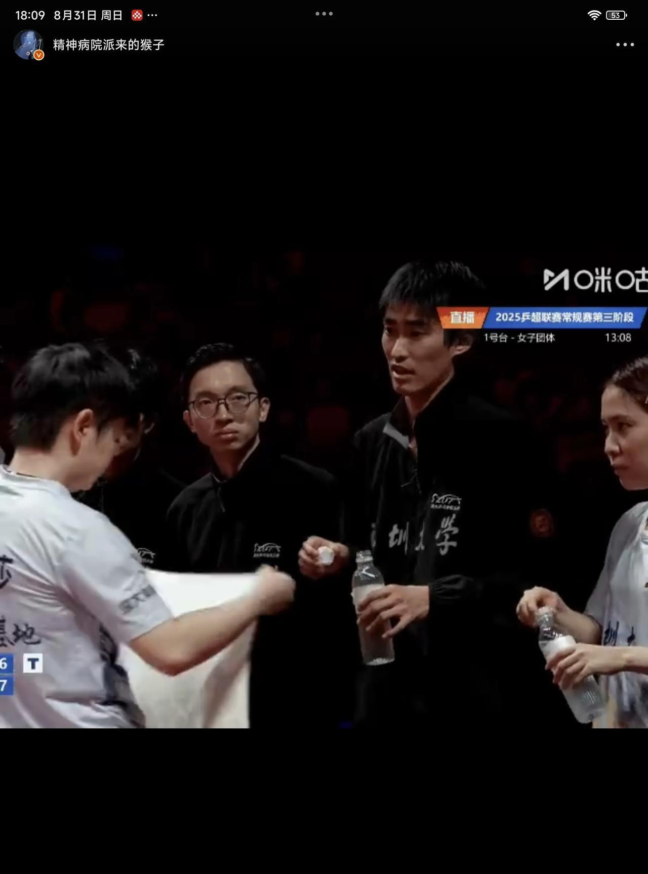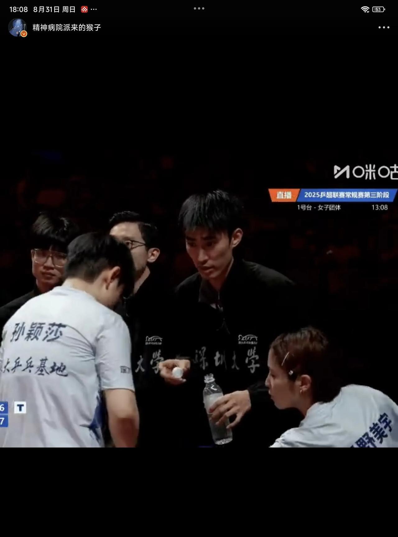 08月31日,孙颖莎在比赛休息间喝水,队友平野美宇积极主动的帮孙颖莎盖上盖子,果