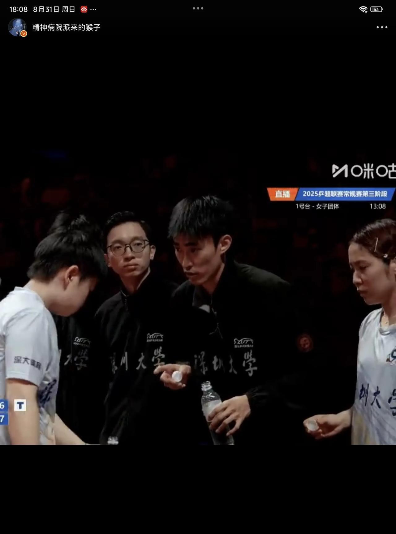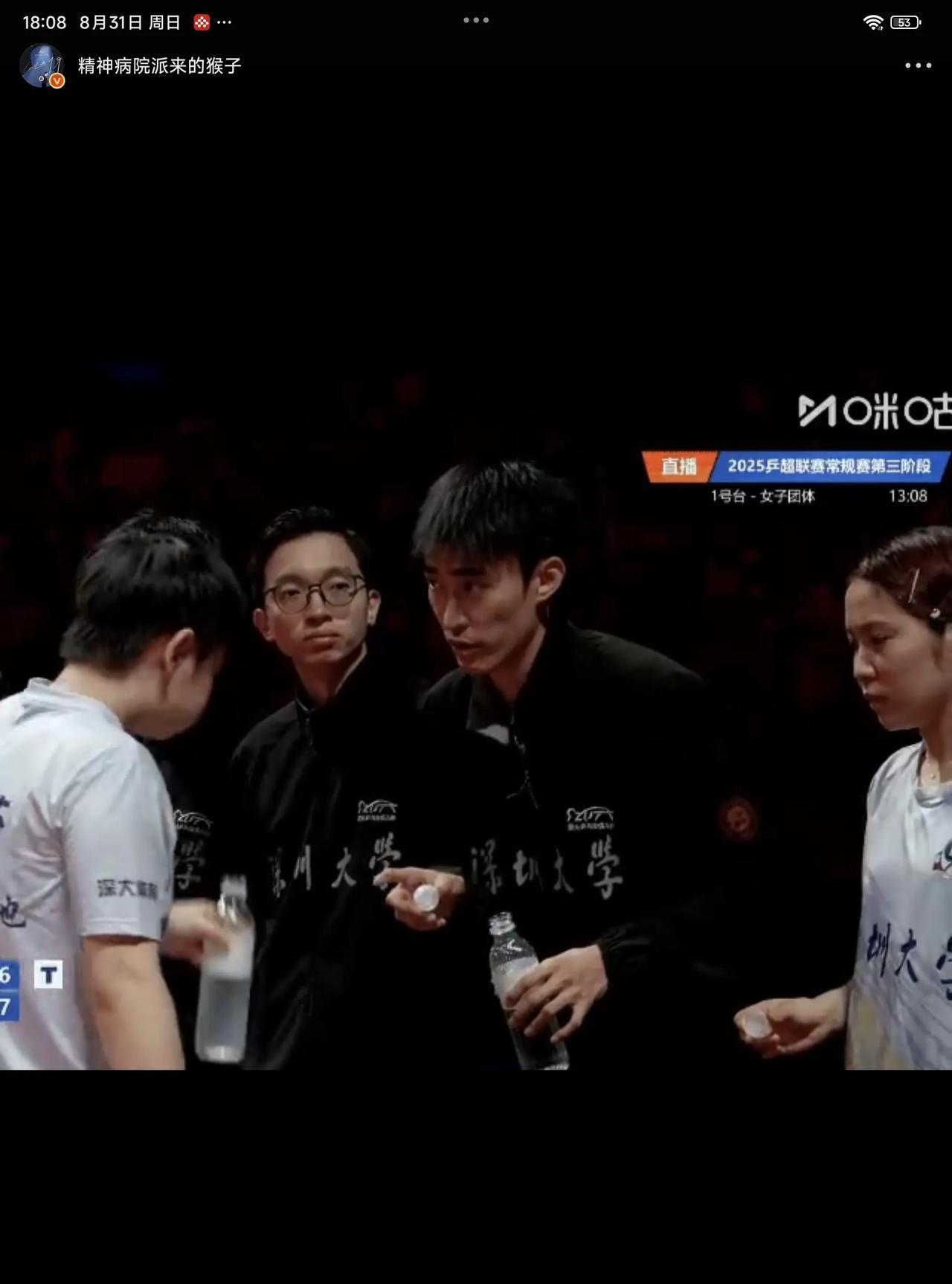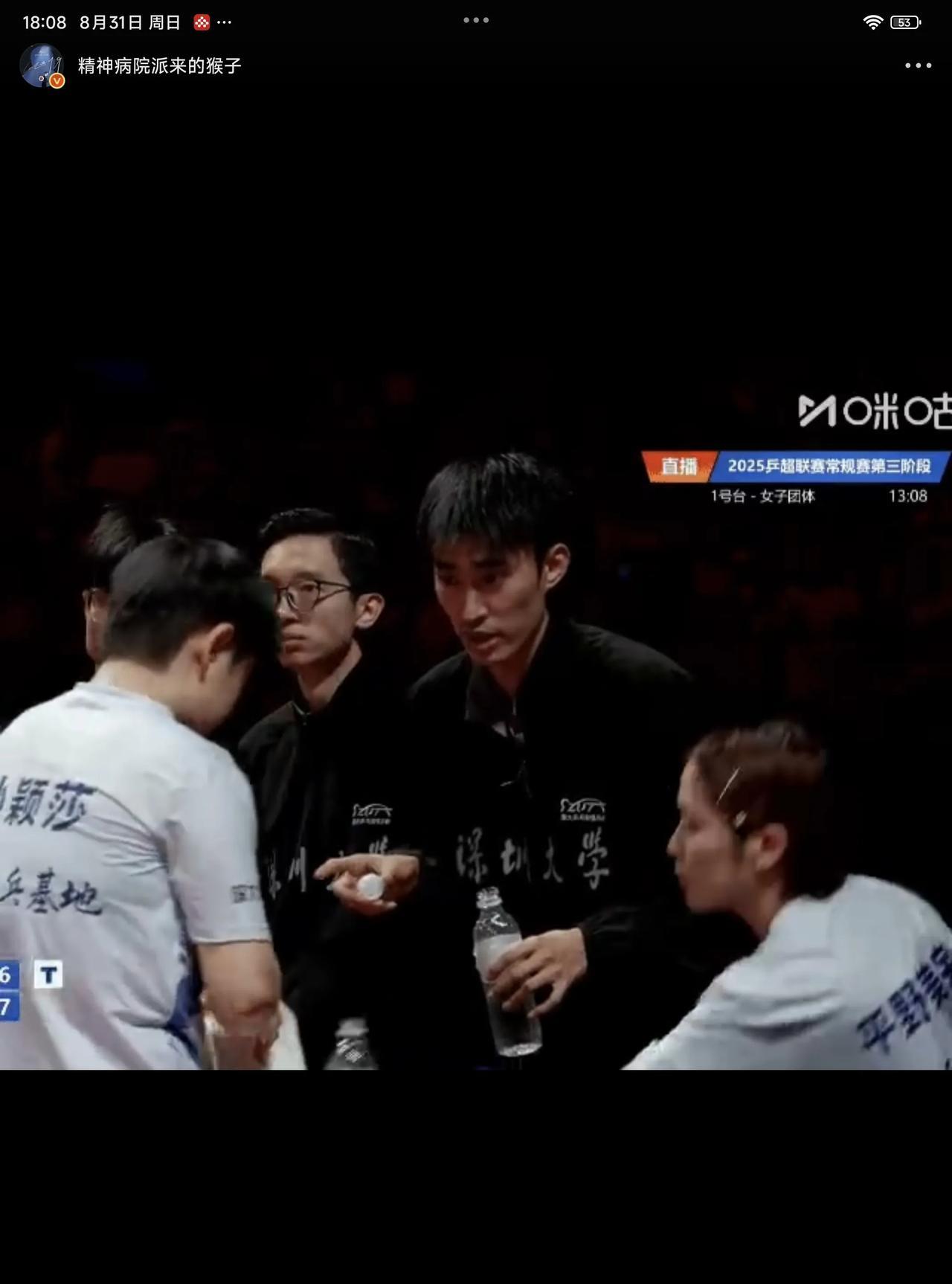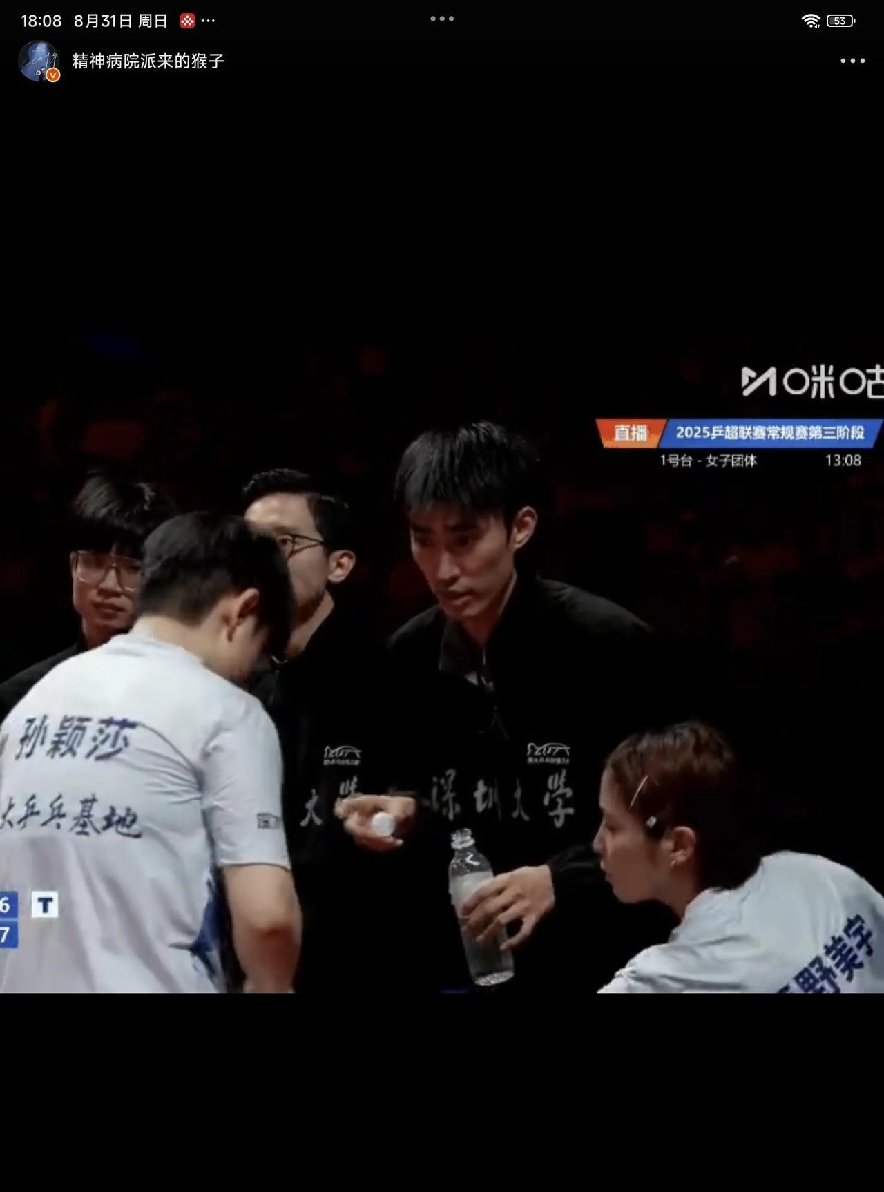 08月31日,孙颖莎在比赛休息间喝水,队友平野美宇积极主动的帮孙颖莎盖上盖子,果