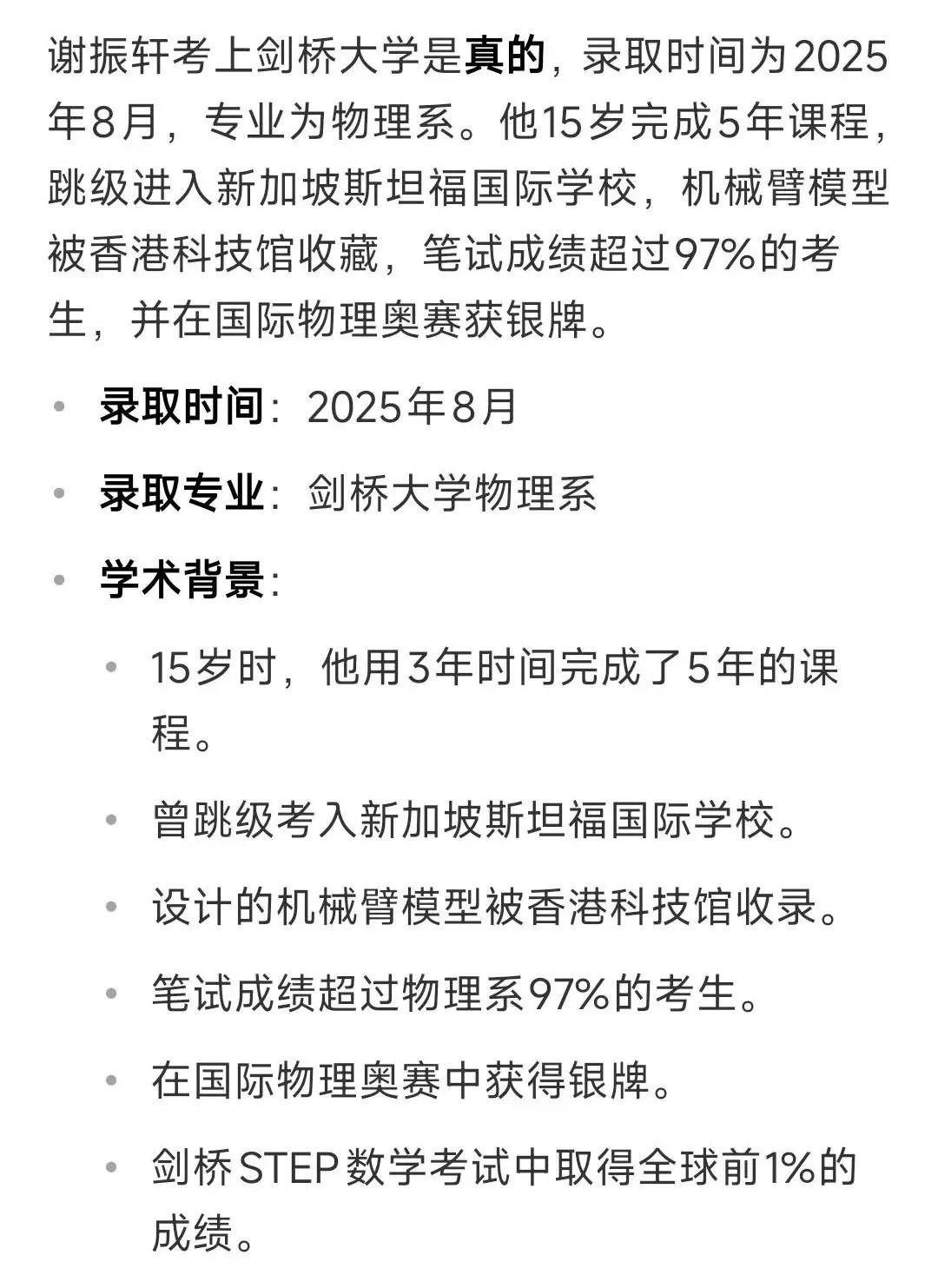 老谢家上八辈都要感谢张柏芝! 养育出了谢振轩这个剑桥物理系生。 从遗传学来讲,儿子的智商多遗传于母亲,这说明从小混迹娱乐圈的张柏芝其实很聪明! 最近谢霆锋应该是全网最高兴的人了,不是因为王菲,也不是因为张柏芝,而是因为自己的大儿子谢振轩,不仅被剑桥大学录取了,而且还是物理系,这真要归功于张柏芝。 说句实在话,剑桥大学的物理系,可真不是一般人能考进的,只凭智商和天赋,都是远远不够的,可见张柏芝作为一个单亲妈妈,为了教育好儿子,背后付出了多少。 别人的星二代,拼爹拼娘拼物质,谢霆锋的大儿子,却在拼硬实力,最让人没想到的,是他考的专业,既不是商科类,也不是管理专业,更不是艺术类,而是物理系。 不得不佩服张柏芝,离婚时被多少媒体群嘲,而她独自带着两个年幼的孩子,这些年来,不仅完成了自己的工作,更是教育出了谢振轩这样争气的儿子,老谢家能不刮目相看吗?大家怎么看?