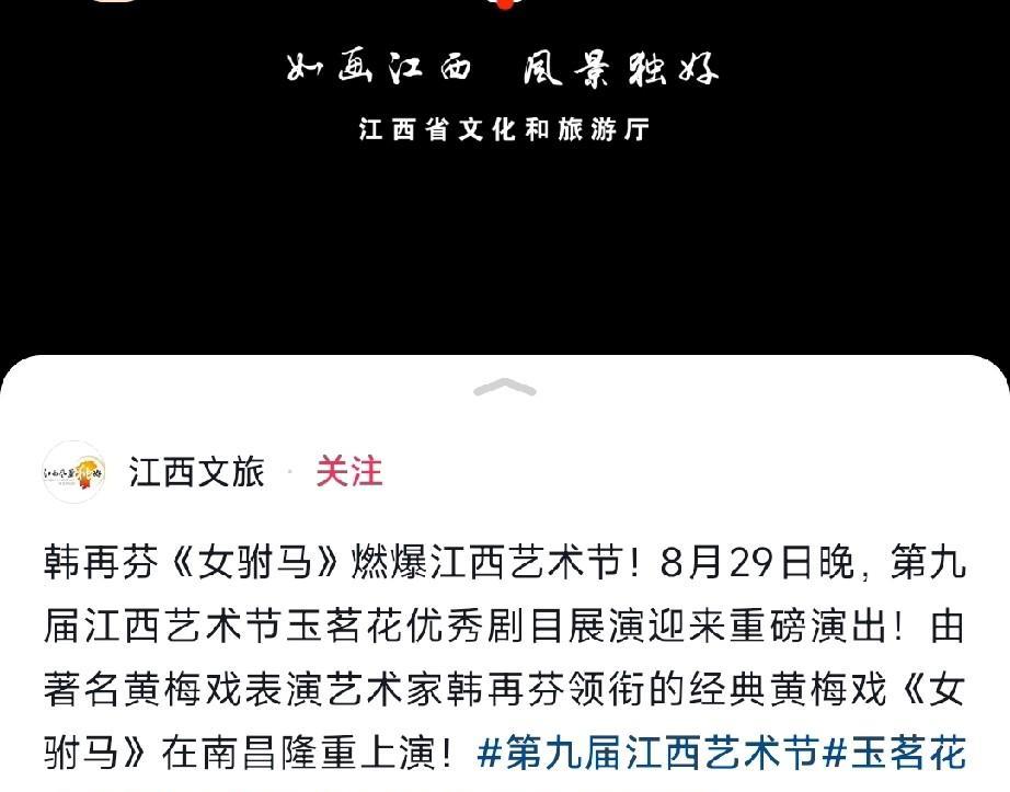 江西文旅:安徽黄梅戏艺术家燃爆江西艺术节,网友们纷纷点赞 江西省文旅厅官方账号江西文旅消息,8月29号,南昌昌南文化中心大剧院,第九届江西艺术节玉茗花优秀剧目展演迎来重磅演出,由安徽著名黄梅戏表演艺术家韩再芬领衔的经典黄梅戏《女驸马》在南昌隆重上演,让江西戏迷享受到了一场视觉盛宴。 江西网友也在评论区表示,他们对黄梅戏艺术的喜欢,感受到了戏曲艺术的魅力,江西戏迷和网友们纷纷点赞。 戏曲最大的魅力,就是需要人民群众喜欢,爱听,安徽黄梅戏艺术名家到江西省演出,江西从官方到民间都给出了高度评价,让戏曲拉进了江西和安徽两省之间的情感关系,黄梅戏成为连接赣皖两省友好的纽带。#黄梅戏艺术节# #黄梅戏艺术展演# #黄梅戏展演# #黄梅戏艺术周# #黄梅戏文化# #黄梅戏齐聚# #南昌文旅消费季# #黄梅戏,井冈山#
