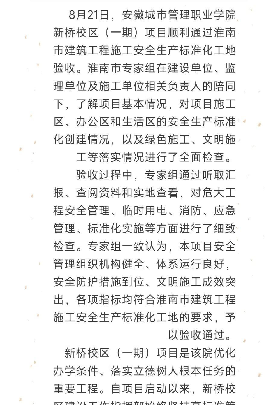 寿县炎刘镇第7所高校,安徽城管学院新桥校区通过淮南市安全工地验收 安徽城市管理职