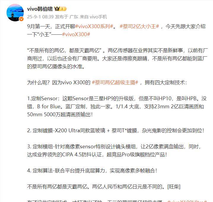 vivo X300系列正式开启预热 1、官方率先放出的是vivo X300的主摄,并且称“不是所有两亿都灭霸两亿”。vivo X系列产品经理还表示大家要擦亮眼,不是所有两亿都能达到蓝厂蔡司两亿级水准; 2、vivo X300的两亿级主摄传感器为HPB,这是vivo独家向三星定制的,它是三星HP9的升级版,但并没有命名为HP10,就因为全球独此一家。这颗传感器1/1.4 大底,支持23mm 2亿巨清画质和50mm 5000万超清画质输出! 3、在定制传感器的基础上还定制镀膜,拥有vivo X200 Ultra同款蓝玻璃 + 蔡司T*镀膜,杂光鬼影的控制会更加到位! 4、特别定制模组,主要是针对高像素sensor特别设计镜头模组,目的是为了让2亿像素满血输出。同时达成业界领先的CIA 4.5防抖认证。整体表现是超竞品Pro级旗舰产品的; 5、在硬件超强的基础上还定制了算法,提升底层算力,实现高像素多帧融合。 4. 定制算法-联合平台提升底层算力,实现高像素多帧融合! PS:vivo X系列产品经理最后表示:有了这些定制技术,才打造出了独一无二的蔡司两亿超级主摄。vivo X100 Ultra的两亿长焦曾经引领了长焦的赛道,我们相信,vivo X300也将引导高像素主摄的未来。明天会给大家聊聊两亿像素大王——vivo X300 Pro。自此vivo X300系列开启了正式预热,从预热来看重点还是在影像表现上,这对于vivo来讲是看家的本领,某种程度上像是一个护城河。问题的关键在于预热是不是有点早了,毕竟要等到10月7号之后才发布。