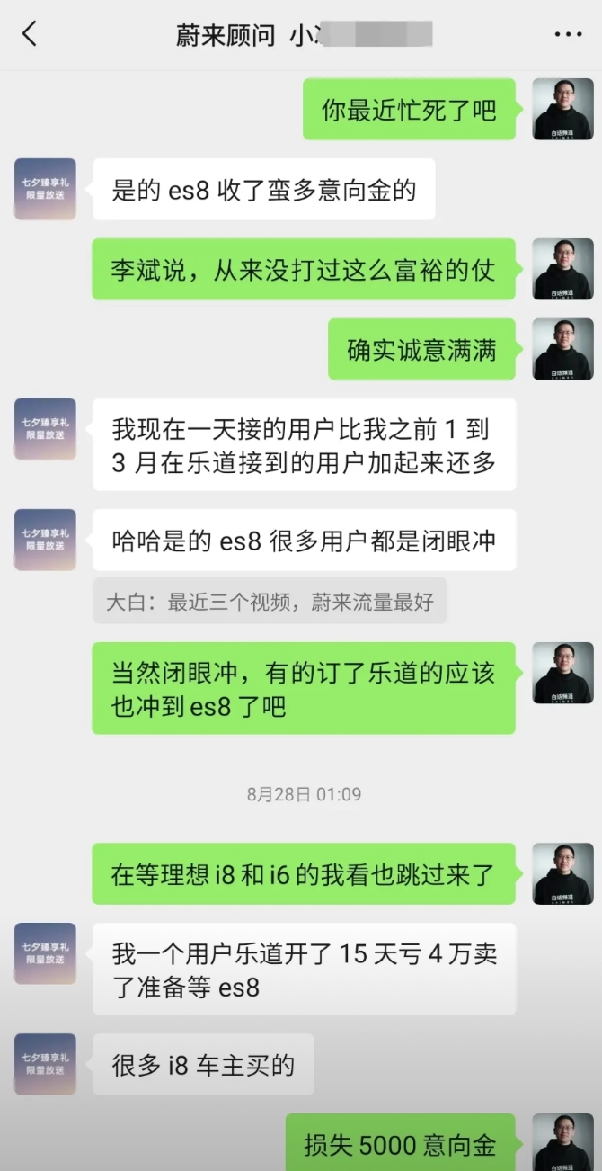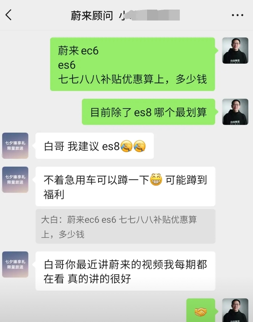给大家披露一个蔚来一线销售小哥的一手信息:蔚来es8确实卖爆了!不光冲击了理想i8和i6,狠起来它连自家的乐道l90都一并打了!我也去现场看了这车!除了车头储备箱那块小气了点,360度无死角地美,国产车里能媲美路虎揽胜的全尺寸suv,只有它!我自己不会买,因为我不太喜欢大车,但这不重视,它确实已经卖爆了。 这个蔚来小哥也是我们《白话汽车》的粉丝,我认识他已经很久了,所以大家看他图一讲的第四句话,他掏心窝子跟我透露一个信息:如果现在想买除了es8以外的其他车型,不着急可以等等!啥意思?意思就是es8降价才刚刚开始,其他车型降价风暴,可能全面到来!