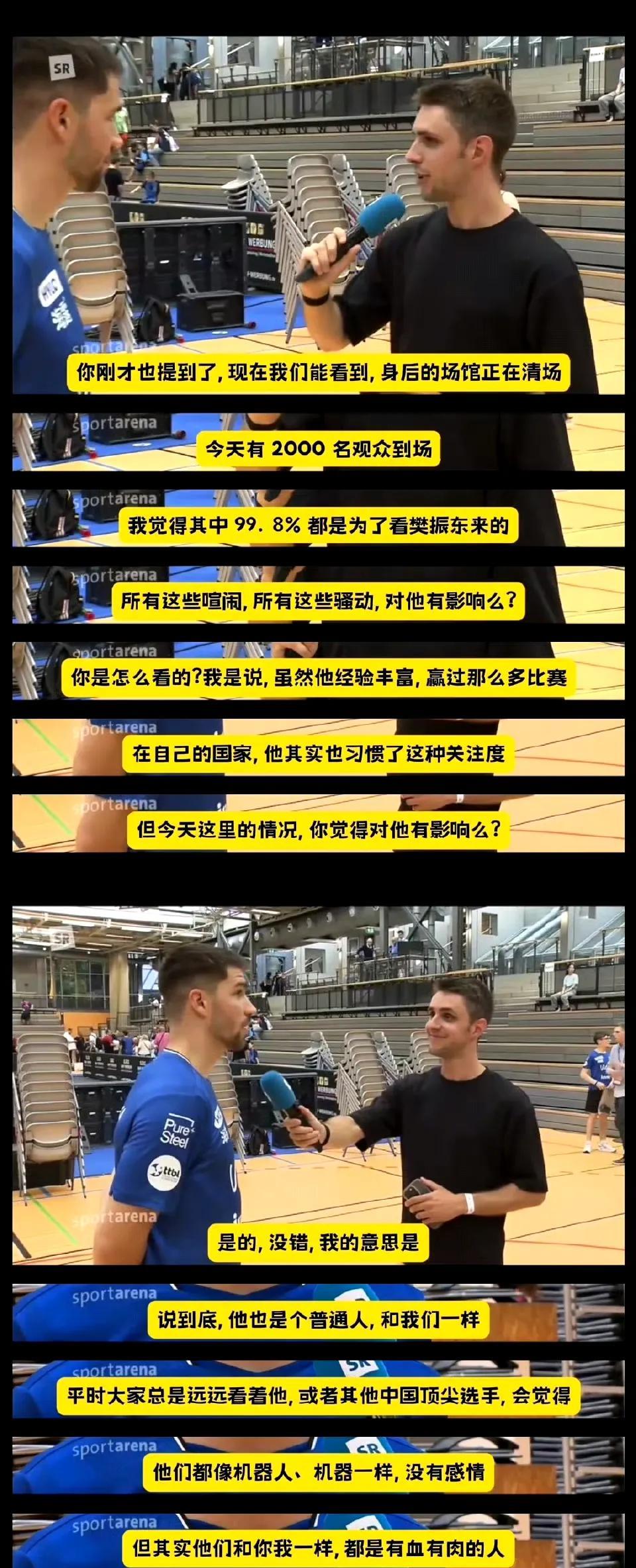 队长弗朗西斯卡采访提到樊振东,说了三点,让人安心了。 第一,樊振东输球后,在更衣室比较比较乐观,没有过于沮丧,因为有太多球迷专程来看他,他已经知道接下来自己该如何改进。这就是顶尖运动员的成熟。 第二,樊振东到萨尔布吕肯,一周下来感觉非常舒服,与队友相处融洽,弗朗西斯科给予了很高评价,说他“友善又开朗的小伙子”。完全陌生的环境,对樊振东来说需要时间适应,已经适应的非常好了。 第三,樊振东不是机器人,他也是普通人。他不是神,即便是奥运冠军也会输球,输球不代表没有责任感,他同样需要学会欧洲人打球的松弛感,没必要把自己崩的太紧。 弗朗西斯卡确实把樊振东当成自己人了。