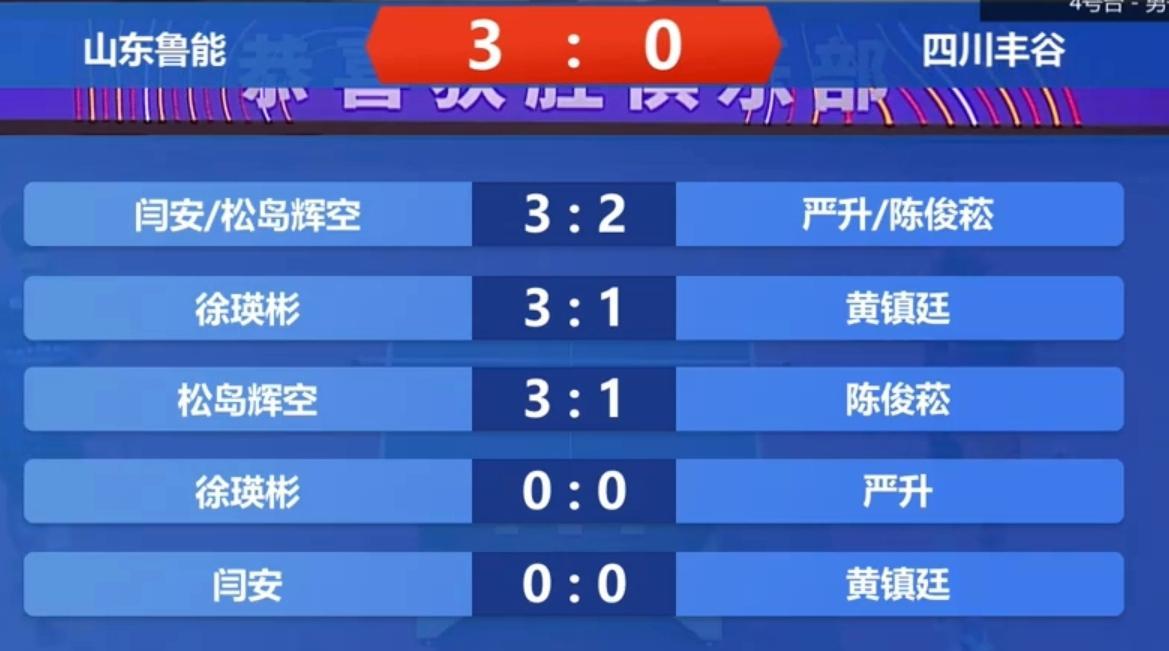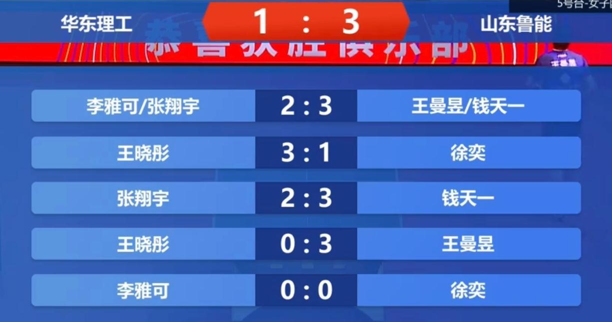 乒超联赛第三阶段9月1日战绩汇总:王艺迪休战,王曼昱带领卫冕冠军力克华东理工大学! 男团比赛,汕头明润意外0比3不敌福建安井,林高远、陈垣宇、徐海东先后输球,队伍成绩跌出前四也无缘总决赛的争夺了! 山东鲁能由徐瑛彬、松岛辉空和闫安出战,以总比分3比0战胜了四川丰谷,获得了总决赛的资格! 黄石华新在林诗栋、向鹏、薛飞三人出战先锋乒羽陈静俱乐部,以总比分3比1胜出,提前一轮晋级到总决赛阶段! 女团比赛,卫冕冠军山东鲁能以总比分3比1战胜了主力王艺迪休战的华东理工大学队,不过以整体成绩看,两队都成功晋级到了总决赛! 深圳大学队与上海龙腾队激战五盘,最终深圳大学队以3比2战胜了上海龙腾,总成绩排名第一! 恭喜恭喜!