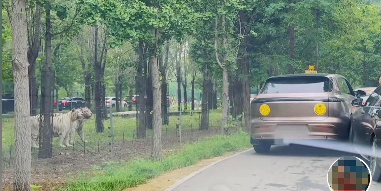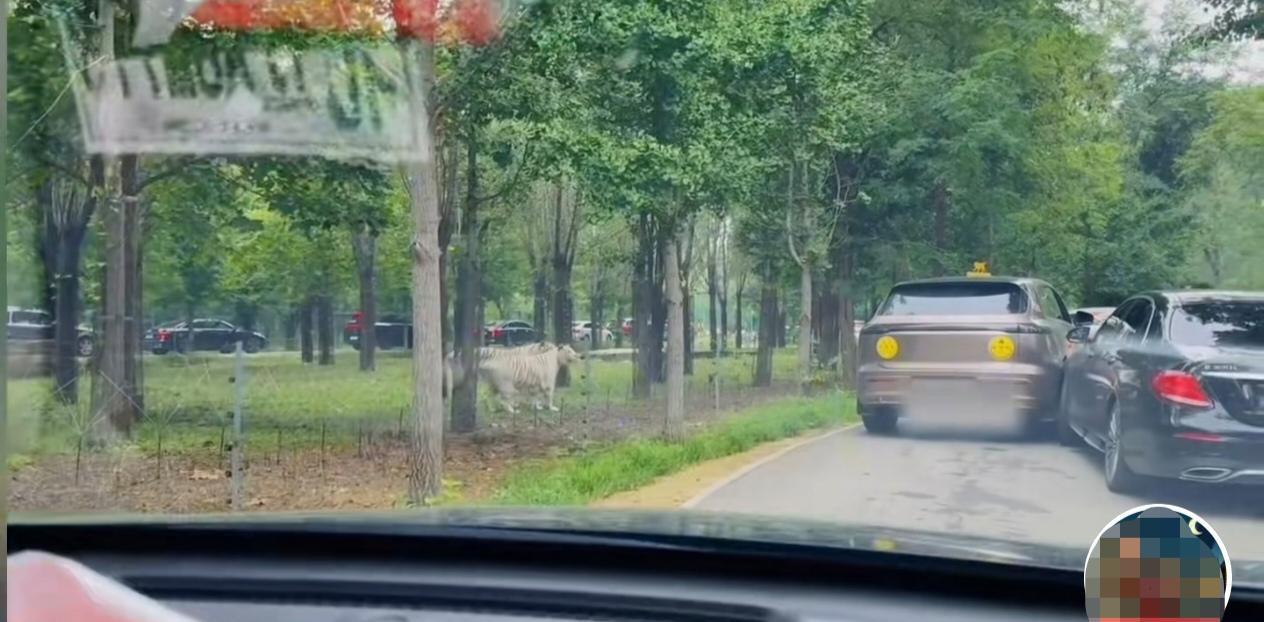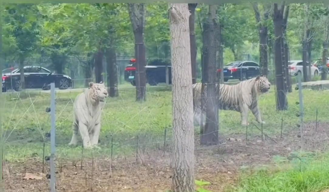 近日,在秦皇岛野生动物园猛兽园区,两辆游玩的车辆发生刮蹭,两名男子竟然不顾危险下车理论,两人的讲话声把旁边的两只白虎给吸引过来了,两只白虎看着眼前的两脚兽站在那里叽里呱啦讲个不停,不知怎么回事,正警惕的盯着二人,如果要不是有电网拦着,估计这两只白虎就会冲上来,这送上门来的美味不能浪费了。