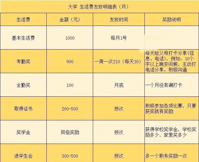 今天关注了一个特别有意思的博主,叫胡妈家,她有一个马上要开学了,大学生的帅儿子,真帅气! 但是妈妈更智慧!拿捏儿子绰绰有余!他儿子小胡要开学了!大学生,生活费一个月1500,是不是有点儿少了? 但是小胡竟然没意见! 妈妈还有奖励政策,联系妈妈一天给10元的红包,如果联系一个月,联系30天,还有满勤奖200块钱!但是如果缺勤一天的话,倒扣20! 是妥妥的基本工资加绩效奖励啊! 大学生一进入校园就放飞自我,没有了父母管束,就像脱缰的野马,估计只有要钱的时候才会和父母联系吧,这种绩效政策保证了他每天都能想起父母呦! 这个妈妈太聪明了,我们大家可以学起来了!