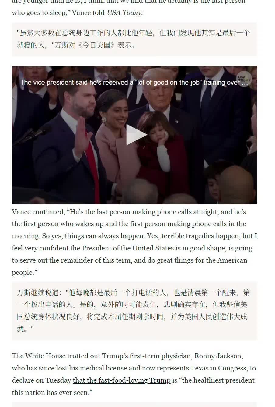 美国共和党内的保守派政治顾问里克·威尔逊表示,随着 79 岁的特朗普显露出年迈迹象,华盛顿正在上演一场"MAGA 版饥饿游戏"。威尔逊在其 Substack 专栏中指出,"来自特朗普阵营的传闻"显示,美国副帅 JD·万斯在这场幕后权力洗牌中"行动迅速",正为尽早接管 MAGA 运动铺路。威尔逊援引万斯本周接受《今日美国》的采访作为幕后角力的佐证——万斯在采访中表示已准备好接任总统职位,并称在本任期前七个月已获得"在职培训"。白宫未回应置评请求。《每日野兽》联系万斯办公室时,对方未就威尔逊的指控作出回应。今年夏天,特朗普严重肿胀的脚踝被多次拍到,他屡次出现无法走直线的情况。其双手还出现过严重淤青,他试图用大量化妆品进行遮盖。白宫 7 月宣布特朗普被诊断患有慢性静脉功能不全,该病症因腿部静脉瓣膜失效导致血液淤积,据称这正是特朗普如今脚踝肿胀的原因。至于其手部淤青,白宫声称是频繁握手配合服用阿司匹林所致,但这无法解释为何淤青会同时出现在双手。今年夏天,特朗普也频频出现口误。8 月 12 日,他声称将赴俄罗斯与普京会晤,实际会面地点却是阿拉斯加。随后他又把俄罗斯城市圣彼得堡称为"列宁格勒"——这个旧称早在 1991 年就已停用。就在最近,特朗普还未能认出就坐在他面前的芬兰总统亚历山大·斯塔布,并且完全说错了密歇根州州长格雷琴·惠特默的名字。