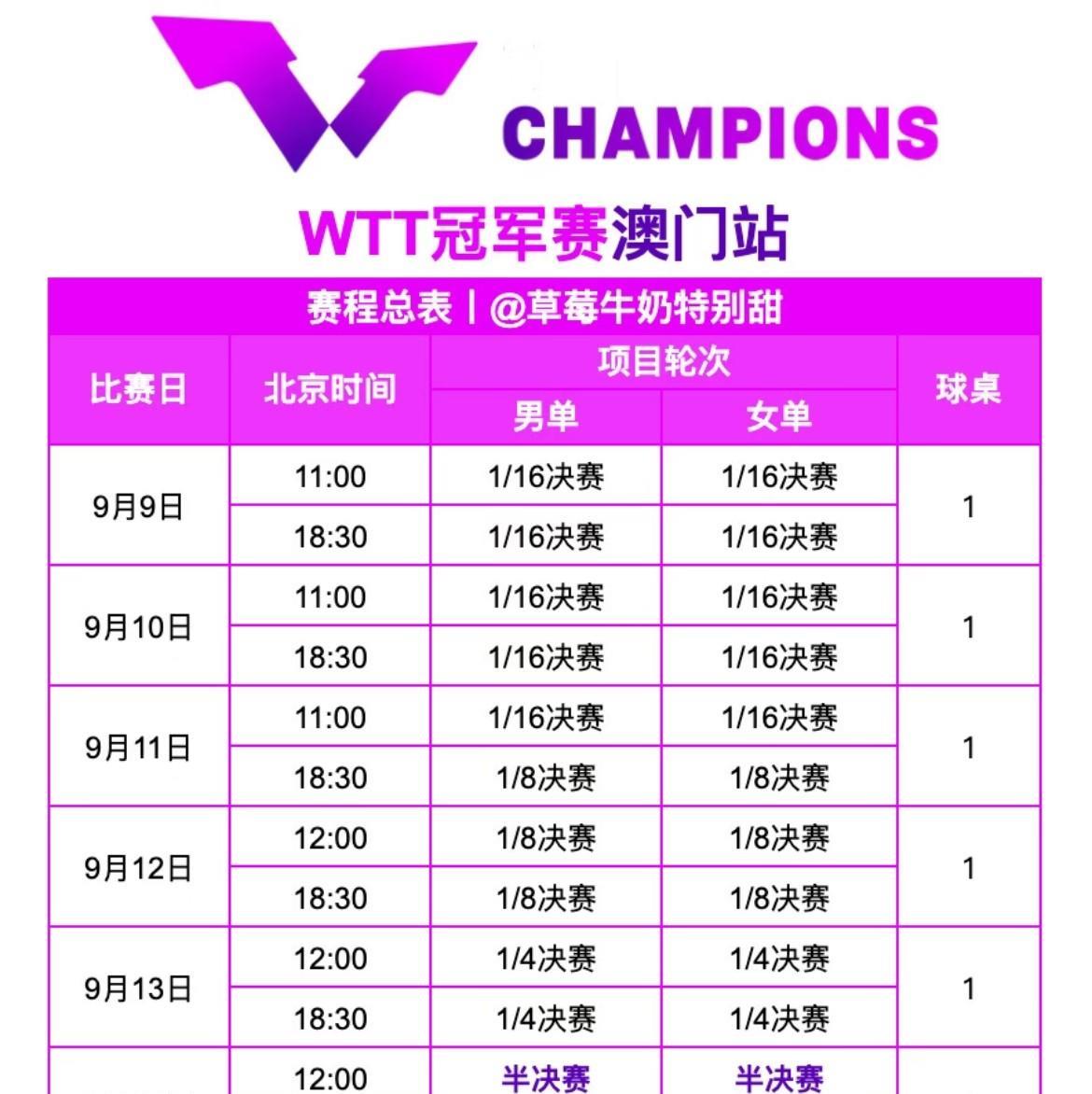 莎莎回北京了…… 乒超联赛第三阶段即将结束,9月9日澳门冠军赛开启,这一站能不能看到哥姐合照?期待! WTT冠军赛澳门站 【赛程总表】P1 【中国队参赛名单】 男单丨林诗栋、王楚钦、梁靖崑、向鹏、陈垣宇、黄友政 女单丨孙颖莎、王曼昱、陈幸同、蒯曼、王艺迪、陈熠 【赛事积分】冠军 1000分丨亚军 700分丨四强 350分丨八强 175分丨十六强 90分丨三十二强 15分 【赛制】1/16决赛、1/8决赛 五局三胜制丨1/4决赛、半决赛、决赛 七局四胜制