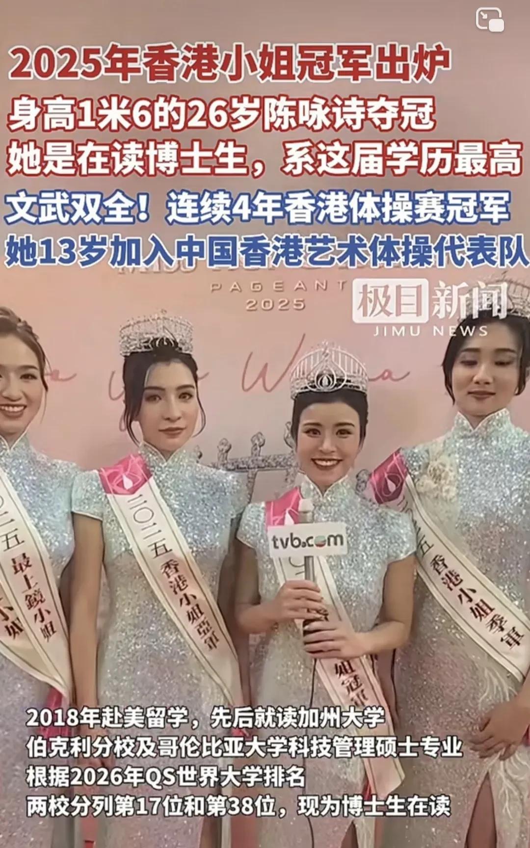 这就是2025港姐冠军 这头型感觉像撞了南墙似的 再看看亚军、季军,也是相貌平平,颜值让人不敢恭维。14个选手站一块,没几个颜值亮眼的,才艺表演更是尴尬。 陈咏诗虽是本届学历最高,毕业于名校还在读博,且3岁练体操,有不少艺术体操冠军头衔,才艺表演的体操也技惊四座,但这也难掩她颜值上的不足。像李尹嫣大气,莫凡有应采儿的影子,可都没拿到好名次。TVB想搞审美多元化,结果却成了大家吐槽的对象,这届港姐选美真是让人一言难尽。
