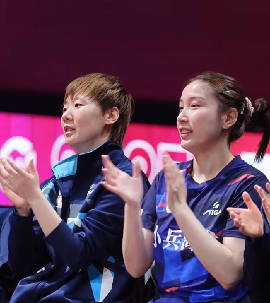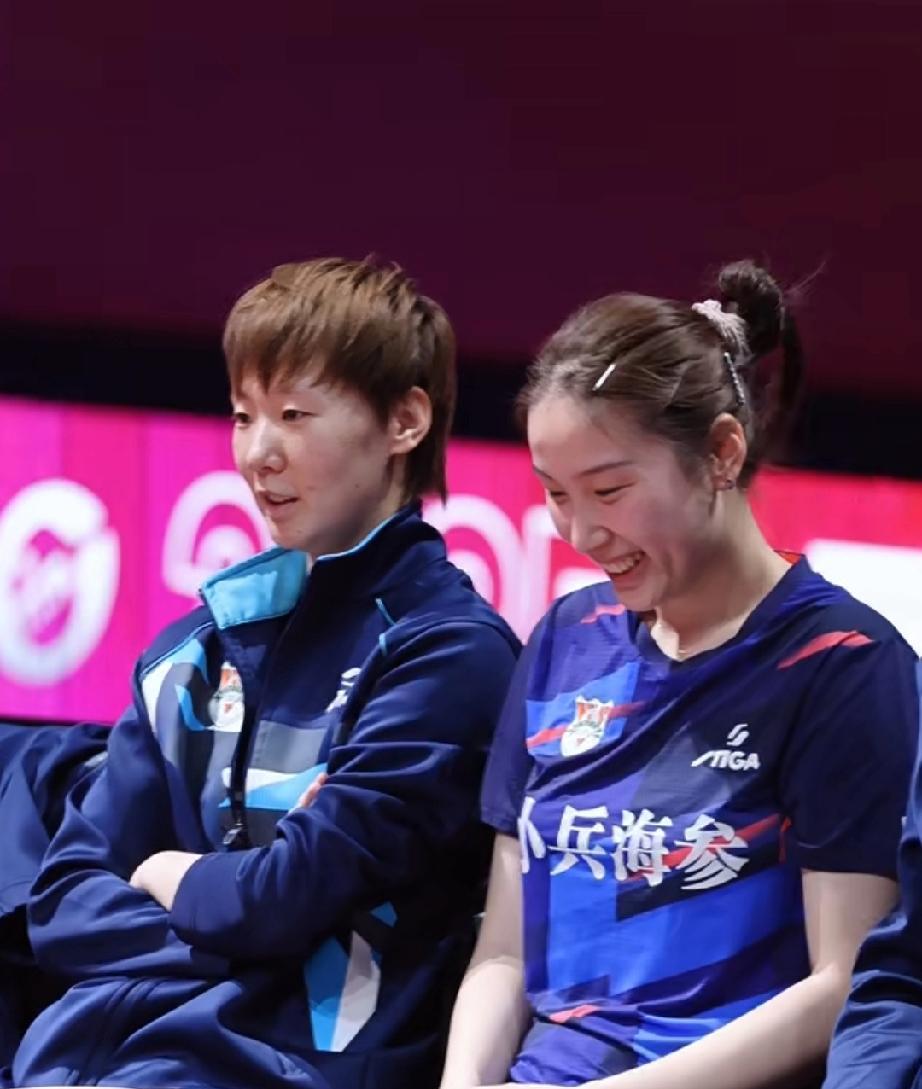 乌鲁木齐乒超联赛现场,山东鲁能俱乐部王曼昱钱天一陈幸同在场下观赛徐奕比赛。 三个