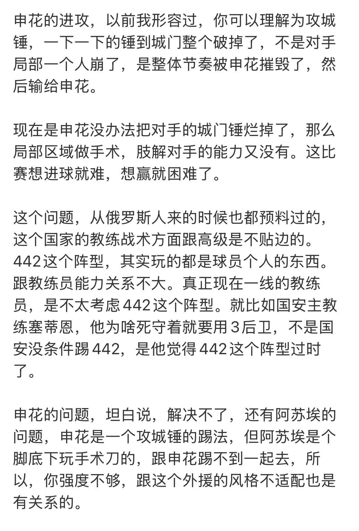 媒体人徐江今天发了一篇长文,指出上海申花当前的一大问题就是攻击乏力。 徐江认为斯卢茨基的执教能力其实很一般,主要是用高强度去冲击对方,如今这套战术显然被许多对手摸透了。 徐江也感觉阿苏埃与申花队的球风不太相符,还不如米内罗和马莱莱呢。