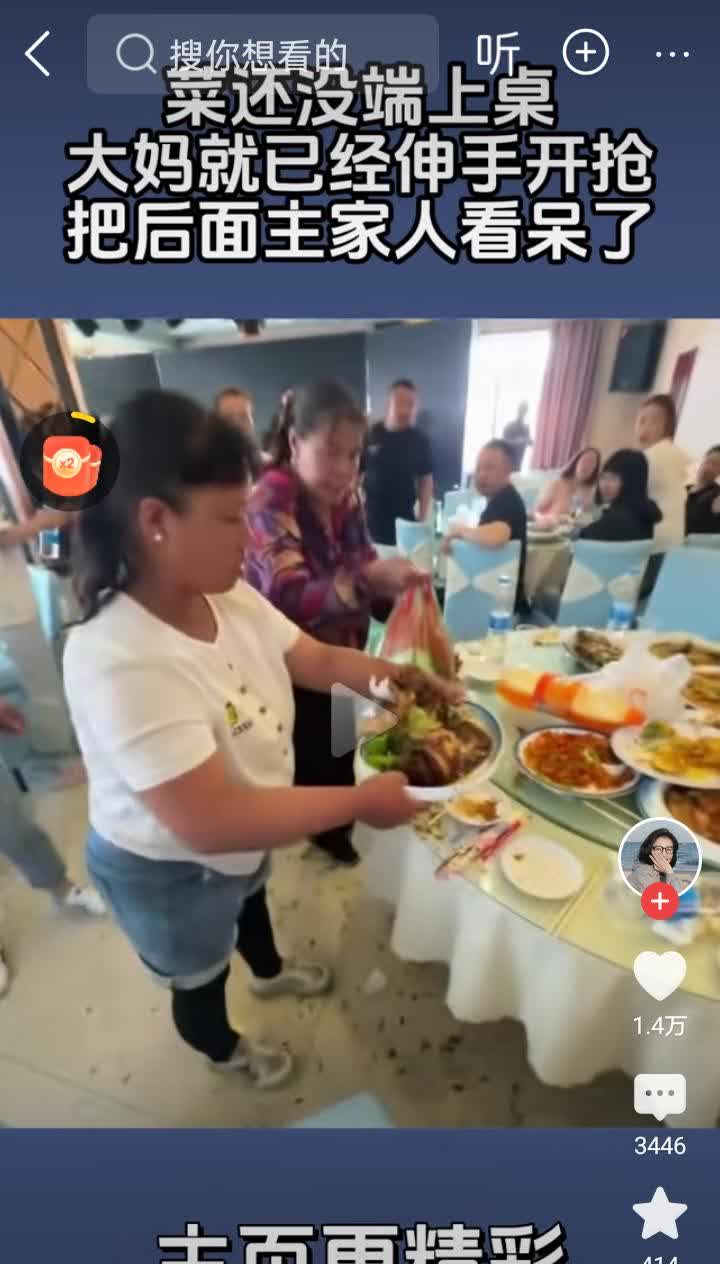 世界之大,什么样的人都有,真的一点羞耻感都不要吗? 一女子不知道是不是主家亲朋好友,但在酒席现场,她看中一盘硬菜上桌,她不顾三七二十三。 直接从端菜人手中接过来,准备打包,桌上的人紧急叫停,女子还不高兴了,直接把菜盘推过去。 女子为什么这桌客人还没吃完,还在上菜,客人还没吃过的菜就端走打包。 这样可好,既难为情又尴尬了。