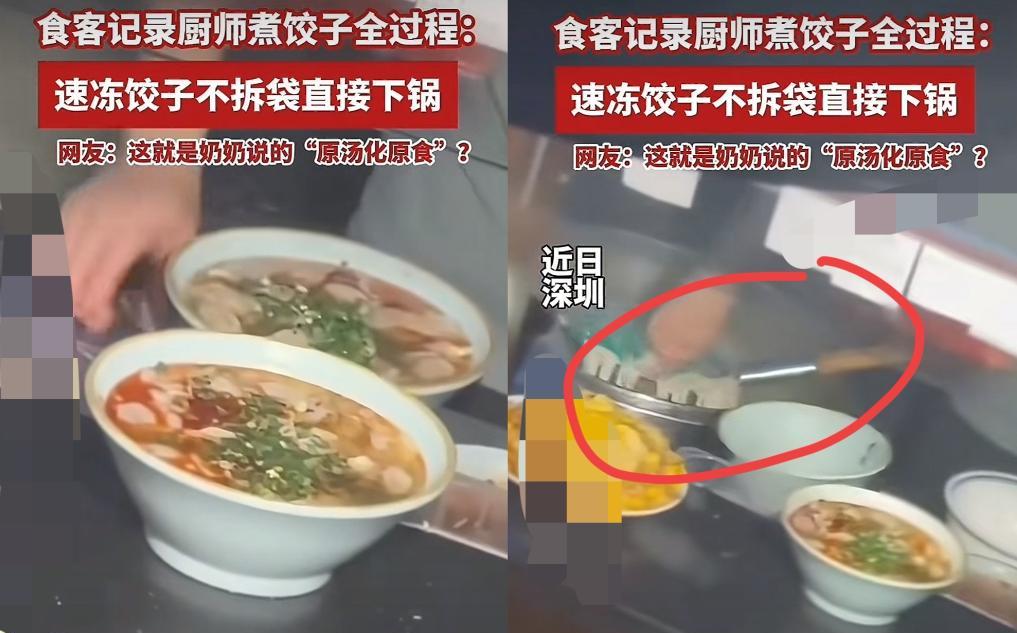 “严查到底!”近日,广东,一家餐馆的厨师在给顾客制作饺子和面条时,竟直接把速冻饺子不拆袋连包装一起放进锅里煮,里面还有其他顾客的面条也放在一起,等煮熟了之后再把塑料袋拆开,饺子就“煮好了”,网友:这样的人必须禁止做厨师! 前段时间,深圳一家餐馆的后厨画面在网上传得沸沸扬扬,起因是一位顾客等着自己点的餐品,等了半天没动静,忍不住往后厨方向看了一眼,这一看,直接让他没了胃口。 画面里,厨师正忙着煮东西,手里拿的不是新鲜食材,而是一袋没拆封的速冻饺子。 更让人惊讶的是,厨师连袋子外面的灰都没擦,就“扑通”一声把整袋饺子扔进了锅里,锅里还煮着其他顾客点的面条。 饺子在袋子里随着沸水翻滚,包装袋慢慢变形鼓胀,过了十多分钟,厨师用漏勺把带袋的饺子捞出来,直接用手放进碗里,这才撕开包装袋把饺子倒出来,空袋子随手就扔在了地上,一看就是经常这么操作的样子。 这段视频被发到网上后,很快就引来了大批网友讨论。有人说这种操作太离谱,呼吁禁止这位厨师再从事这行,还有人觉得这可能不是个例,很多外卖店说不定都这么干。 后来南国早报也报道了这件事,当地监管部门也很快介入,涉事餐馆正在接受调查。 有意思的是,顾客后来提到,自己来餐馆吃饭,本来是想避开预制菜,图个放心,没想到不仅吃到了速冻饺子,还遇上了连袋煮的操作,而且这饺子卖得比自己在家煮的贵不少,感觉被糊弄了。 要说这连袋煮饺子,危害可不小。 长时间煮下来,袋子很可能会释放出双酚A、邻苯类增塑剂这些有害物质,长期吃进肚子里,对内分泌系统和生殖系统都没好处。 而且袋子上印字的油墨也不安全,高温煮过之后,油墨很可能会溶解到汤里,连带着袋子外面的灰,这些都成了污染源,再加上饺子和面条在一口锅里煮,交叉污染的风险也很大。 面对质疑,涉事餐馆说用的是食品级耐高温包装袋,连袋煮是为了保持饺子的原汁原味。 可懂行的人都知道,就算是食品级塑料袋,也只能装常温或者低温的食物,根本不能放进锅里煮。 其实明眼人都能看出来,商家这么做,无非是为了省时间,避免拆袋时饺子掉锅里不好找,同时也能少洗点东西,说到底还是把成本和效率放在了顾客健康前面。 这些年预制菜越来越普遍,本来是为了方便,可有些商家却借着预制菜的名头,连最基本的操作规范都丢了,有的用过期预制菜,有的储存环境不达标,这次的连袋煮饺子只是其中一个例子。 更让人担心的是,很多中小型餐馆平时监管不到位,检查容易走过场,这些违规操作要是没被顾客拍下来,可能还会一直藏在后厨里。 顾客愿意花钱去餐馆吃饭,图的就是放心和方便,可要是连最基本的卫生都保证不了,慢慢就会失去大家的信任。 现在不少人在外吃饭都会优先选透明厨房的餐馆,就是想亲眼看着食材怎么处理、怎么烹饪,毕竟谁也不想在不知情的情况下,吃进一堆不该吃的东西。 信息来源:大象新闻