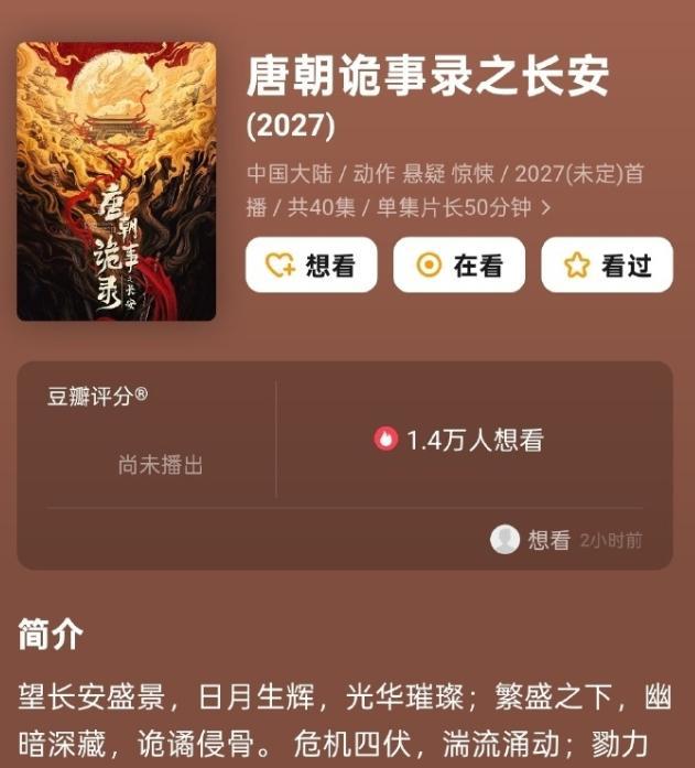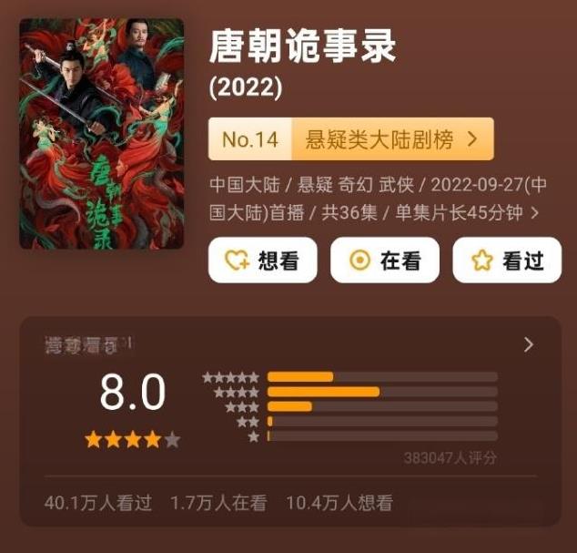 《唐朝诡事录》是近几年播的最好的探案剧 第三季《唐朝诡事录之长安》已经完成配音工作,有望11月份播出,这部剧还有第四季《唐朝诡事录之蜀道》,已经有很多年没见过拍很多季的电视剧,且每一季的口碑和播放数据都很不错的电视剧了。第一季38万人给了豆瓣8分,第二季29万人给了豆瓣8.6分,第二部比第一部口碑还好的剧非常罕见。