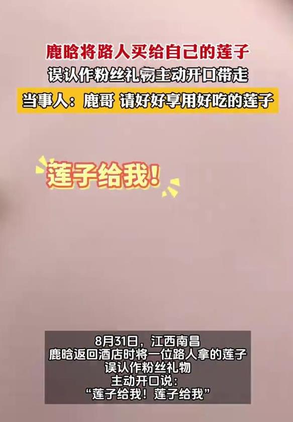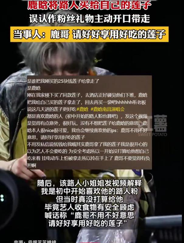 鹿晗这次真的是“一次主动”,换来“终身内向”! 事件起因是8月31日,鹿晗南昌演唱会结束返回酒店的时候,看到人群中一位路人小姐姐拎着新鲜莲子,误以为是粉丝送的礼物,连喊两次 “莲子给我!莲子给我!”,伸手就把莲子拿走了,转身就走。 小姐姐当场没反应过来,等反应过来时只能大喊 “哎?我的莲子!他把我莲子拿走了!”。 而这袋“意外得来” 的莲子,更是被鹿晗带上了后续的演唱会舞台。 很快,被拿莲子的小姐姐 “爱喝芝芝桃桃” 在网上发声,还原了真相,表示自己也是鹿晗的初中粉,当天在酒店附近只是 “凑热闹”,根本没打算送莲子 —— 因为知道艺人收食物有安全顾虑,本来是买给自己吃的,没想到会被偶像 “主动要走”。 不过对于鹿晗拿走莲子,她一点没生气,反而说 “鹿哥拿了我的莲子我又惊讶又开心,这事特别巧合好玩”,还大方喊话鹿晗 “请好好享用 20 元 / 斤的莲子,不用转钱给我”(后来她重新买时发现市价约 20 元 / 斤,还调侃了鹿晗砍价到 22 元 “买贵了”)。 有网友调侃:“别人给你的食物可能会被下药,不要吃,但是自己主动要的可以吃 ,因为来不及下药~” 但也有网友表示:“真的是路人吗?碰巧包装很好,碰巧在鹿晗同个酒店,碰巧遇见鹿晗,碰巧被鹿晗“拿”?” 其实面对这一幕,更多粉丝担心的是存在行为过激的“私生饭”,毕竟又是相同酒店又是莲子的,确实有些过于巧合。 最后只能说鹿晗真好呀,这种情况下还愿意收信和收东西,是因为这莲子给他的才拿的,希望大家都不要蹲酒店、不要追私,在安全的地方和鹿晗见面哈。