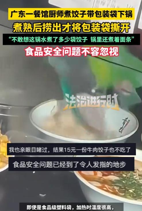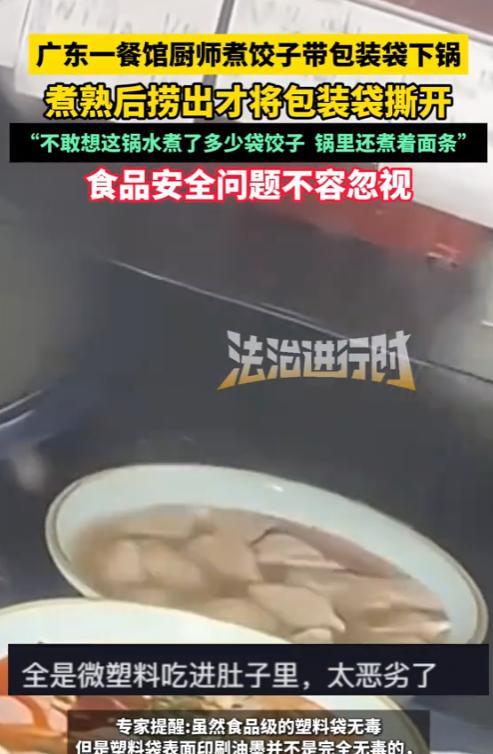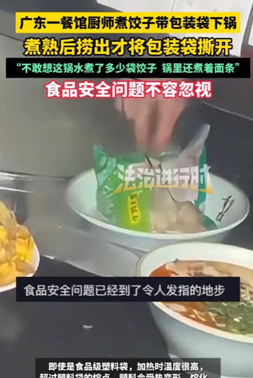 “必须严惩!”2025年8月,广东,一饭店厨师煮饺子时,竟然带包装袋下锅,煮熟后,将水饺捞出来,才将包装袋撕开,而蒸锅还混着面条,不敢想象,这锅水煮了多少的袋的饺子!网友:太恶心了! 事情是顾客去饭店吃饭时发现的,当时他等着上菜,偶然瞥见后厨窗口,就看见厨师拿出来一袋没拆开的饺子,直接扔进开水锅。 那塑料袋子在滚烫的水里翻滚,不敢想象,这一锅得有多少有害物质,这顾客吃下肚子里,身体怎么代谢出去,等厨师捞上来,随意一撕开,就出炉了。 更让人不舒服的是,后厨的蒸锅也乱糟糟的,里面既蒸着饺子,又混着面条,食材堆在一起,看着毫无章法,顾客越想越后怕:这锅煮饺子的水,是不是煮了好多袋带包装的饺子? 塑料袋在开水里煮,会不会析出有害物质,这些吃进肚子里,对身体肯定不好,他把拍到的画面发到网上,很快就炸了锅。 有网友说:“连基本的卫生都不顾,是觉得顾客看不见就可以随便来”,还有人吐槽:“现在出去吃饭都得提心吊胆,不知道商家还藏着多少猫腻。” 更多人呼吁监管部门介入:“必须查清楚这家店,该罚就罚,不然以后还会有商家这么干”,其实,饭店卫生问题一直是大家关心的事儿,出去吃饭,图的就是个方便、放心,可总有商家为了省事儿,忽略卫生。 像这种带袋煮饺子的行为,不仅不卫生,塑料遇高温还可能产生有害物,吃了对身体有害,这哪是做生意,简直是拿顾客健康当儿戏,做生意得讲良心,卫生和安全是底线,不能有半点马虎。 信息来源:《广东一餐馆厨师煮饺子带包装袋下锅,煮熟后捞出才将包装袋撕开“不敢想这锅水煮了多少袋饺子锅里还煮着面条”食品安全问题不容忽视》法治进行时
