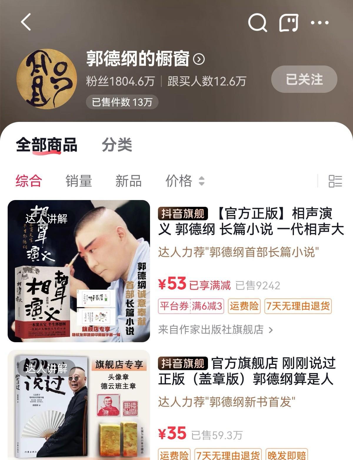 #秋日生活打卡季# 郭德纲的《相声演义》,真的不好卖了。 郭德纲,于8月26日晚上9点,专门开了一场直播,推介他的第一部长篇小说《相声演义》。 虽然发了视频,虽然直播了两个多小时,但《相声演义》的销量,并没有让郭德纲满意。 截止到刚刚,郭德纲《相声演义》的总销量为9242本,跟他《刚刚说过》59.3万的销量相比,简直是天壤之别。 《相声演义》定价是79元,郭德纲橱窗的价格为56元,足足便宜了23元。 这样的优惠力度还是比较大的,我最近很少买书,再加上我也不是纲丝,所以即便只是30多块钱,我也没有买的打算。 让我纳闷的是,郭德纲的抖音粉丝就有1800多万,为什么好几天过去了,销量还不到1万本?难道那些都是假纲丝?