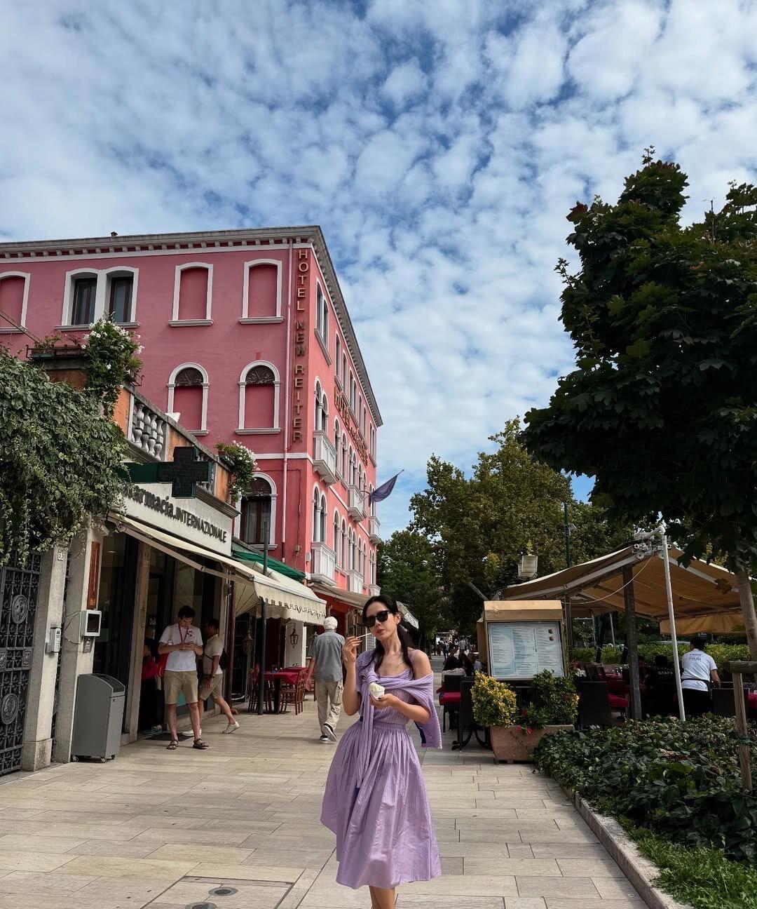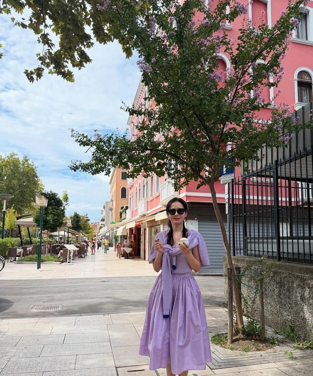 孙艺珍这次穿搭好温柔…… 薰衣草紫的吊带背心,搭配一条高腰的A字裙浪漫温柔,很有