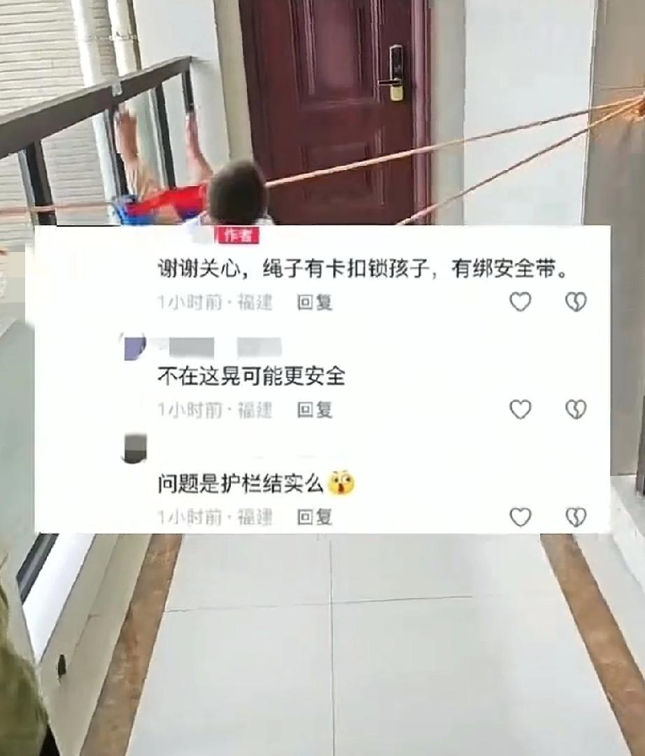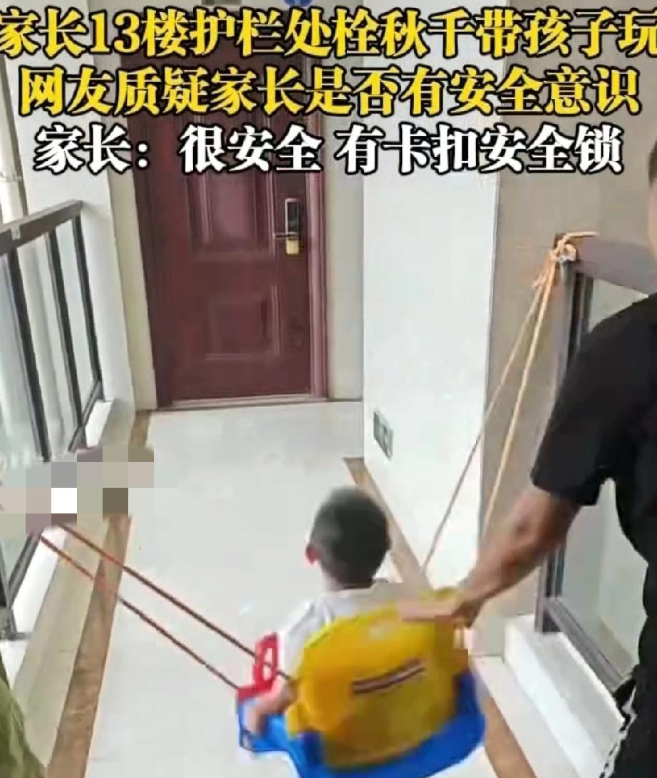 8月31日,福建。爸爸带娃。为了让孩子玩得开心,爸爸用土办法做了个秋千。他将绳索栓在13楼的护栏,绳的中间放椅子。孩子坐在椅子上,爸爸用手推着孩子荡秋千。 孩子很胆大,在这么高的地方晃来荡去,一点也不害怕,反而很开心。但是让看的人心惊肉跳。如果孩子荡出了护拦,那可是深渊啊! 爸爸一点也不在意,称很安全,有卡扣安全锁。 真的很安全吗?那倒不一定。如果把护拦晃松了,就有可能把孩子甩出护拦。 孩子的安全很重要,一定要考虑周全。保证孩子的安全万无一失,千万不要掉以轻心。 #家长13楼护栏处拴秋千带孩子玩##爸爸带娃# #晒图笔记大赛#