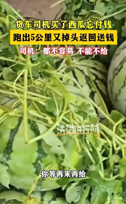 “太有人情味了!”8月27日,山东临沂,一男子买完西瓜后光顾着和老板聊天了,没付钱直接上车就走了,开出去5公里地了,快到家时才想起来忘记付钱,于是立即掉头回来送钱!老板大方表示:没事,等回头再给也不迟。网友:这就是劳动人民的淳朴! 相信很多人忘记付钱都不是故意的,有些人记性不太好,偶尔会忘记付钱,等到想起来后一般都会立即返回送钱。 当天中午,一货车司机回家时,看到路边有个大妈在卖西瓜,刚好自己也有些渴了,就停下车买了一个回家吃。 称完装袋后,男子光顾着聊天了,将西瓜放到车上后就开车走了,并没有察觉到还没付钱这回事。 眼瞅着就要到家了,男子这时才想起西瓜没付钱,虽然只是几块钱,等第二天再送去也没事,但人家这么热的天在外面摆摊也不容易,男子立即掉头返回。 男子刚走过去就问大妈:怎么没付钱就让我走了? 大妈听后也是一笑,直言“没事,之后过来再给也行”。 网友看后表示,如今手机支付非常方便,省去了找零钱的麻烦,也不用再担心现金丢了,不过也导致有的人买完东西后没付钱就走了,虽然不是故意的,但多少还是挺尴尬的。 信息来源:《货车司机买了西瓜忘付钱,跑出5公里又返回付钱,大家都不容易,不能不给》法治进行时
