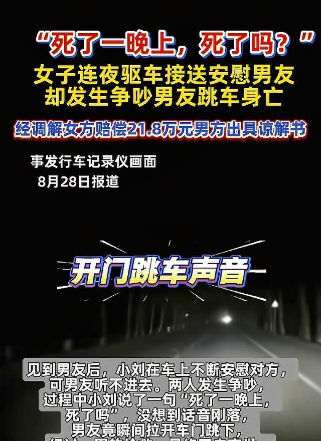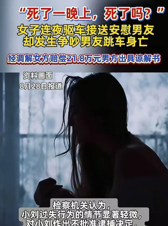 如果男友向你表示有轻生念头,你会怎么做?山西运城一女孩在听到男友这样说后,连夜开车赶路快百里,见到男友后,他却因女孩一句话拉开车门跳车,抢救了一周后不幸离世。女孩也因此面临着刑事责任与民事赔偿。 据极目新闻报道,事情发生在山西省,女孩位于运城市,她的男友位于河津市,两地相距百里左右。 在2024年4月的一天晚上,男友喝多后,跟女孩打电话,电话中男友说了有轻生的想法。 这让女孩极为不安,立马驱车去找男友。 见面后,两人在车上,女孩边驾驶着车辆,边不断对男友进行安慰,希望男友不要想不开。 不知道是酒精作用太大,还是男友轻生念头强烈,男友始终听不进去女孩说的话。 专门赶来的女孩,心思也花了,口水也费了,最终也失去了耐心。 本来女孩是为了男友专门跑来,男友见到女孩也该开心,可是,两个人却在车上吵了起来。 争吵越来越激烈,也让人失去理智,女孩赌气说了一句“死了一晚上,死了吗?” 却不想,男友竟然立马开门跳车。 这举动无疑是让人震惊的,对女孩来说更是吧,难过、自责、害怕、后悔这些情绪杂糅,全部涌向她。 男友在医院进行了长达一周的抢救,最终还是不幸离世。 然而,女孩面临的不仅是男友离世的痛苦,还有一系列的法律追责。 当地公安机关立案侦查并提请批准逮捕女孩,因为女孩涉嫌过失致人死亡罪。 致人死亡的意思是好理解的,可是,什么是过失? 根据《刑法》第十五条有规定,应当预见自己的行为可能发生危害社会的结果,因为疏忽大意而没有预见,或者已经预见而轻信能够避免,以致发生这种结果的,是过失犯罪。 女孩自己肯定知道这句话不好,但是日常生活中可能谁都会有放狠话的行为。女孩说出这句话的时候是觉得男友知道,自己真实的意思并不希望他去死,而是一时气话。 但男友却把气话当真,直接跳车,造成了最终的死亡。所以女孩这句话出口,其实是有风险的,即使在气头上。 如果男友没有跳车,那么这只是一句气话,但是男友跳车了,女孩这句话就是过失行为,是要负法律责任的。 根据《刑法》第二百三十三条规定,过失致人死亡的,处三年以上七年以下有期徒刑;情节较轻的,处三年以下有期徒刑。本法另有规定的,依照规定。 所以,根据法律规定,女孩甚至还有被判刑的可能。 女孩的过失言论导致男友死亡,损害了男友的生命权,根据《民法典》第一千零二条,自然人享有生命权。自然人的生命安全和生命尊严受法律保护。任何组织或者个人不得侵害他人的生命权。 根据《民法典》第一千一百七十九条,侵害他人造成人身损害的,应当赔偿医疗费、护理费、交通费、营养费、住院伙食补助费等为治疗和康复支出的合理费用,以及因误工减少的收入。造成残疾的,还应当赔偿辅助器具费和残疾赔偿金;造成死亡的,还应当赔偿丧葬费和死亡赔偿金。 经调解,女孩向男友家属履行支付赔偿金21.8万。男方家属也出具了谅解书。 其实,整个事件里,女孩的过失致人死亡行为是显著轻微的,是言论不当。 检方决定不批准逮捕,警方也按照规定撤销了案件。 仅仅是一句话,不当真它就是一句话,当真了便要为它所造成的结果负责。 对于此,你有什么想说的吗?发表在评论区一起讨论吧!