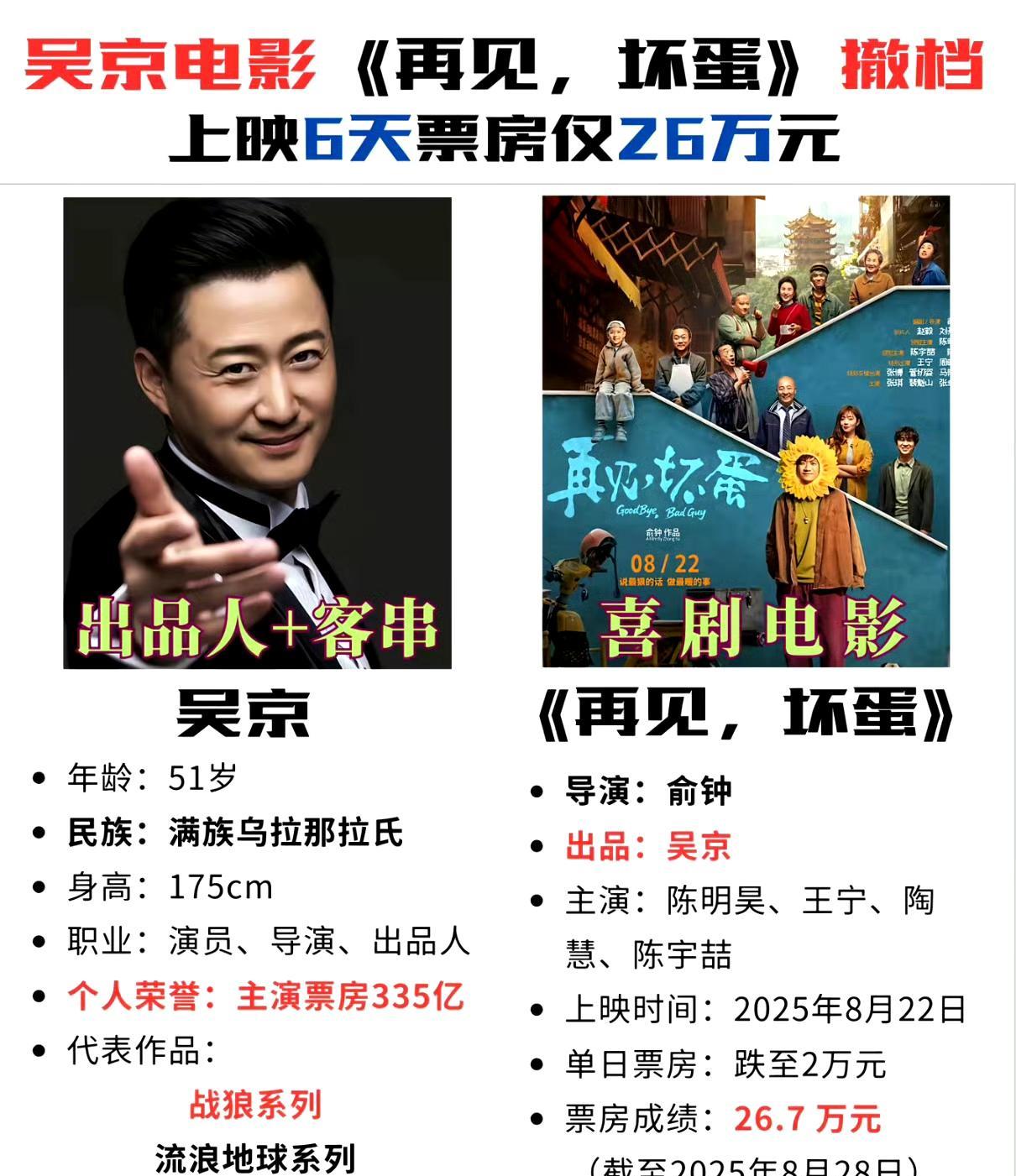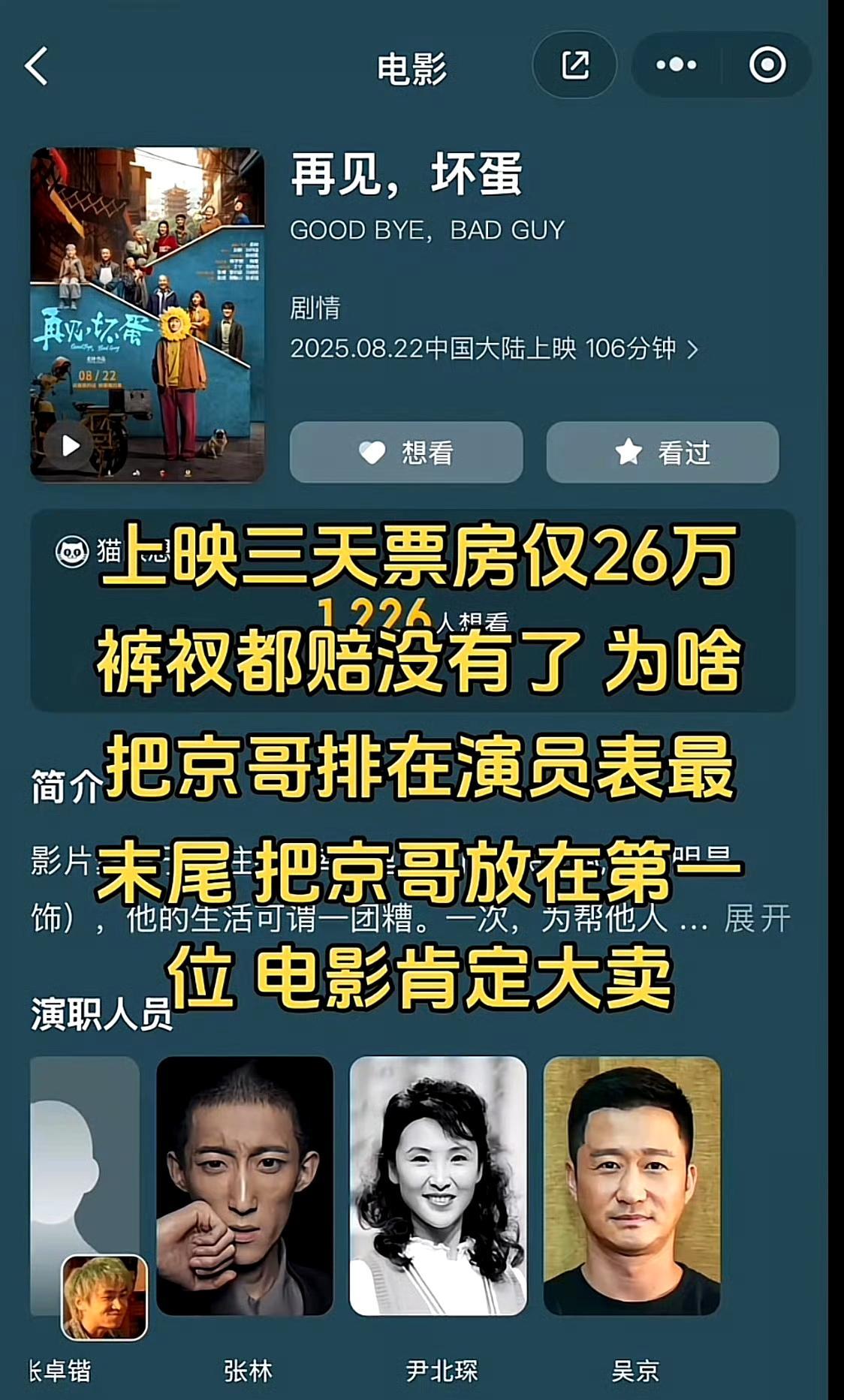 #再见坏蛋官宣撤档# 一般来说,不少“三无电影”尚能收获百万票房,而《再见坏蛋》票房连30万都未达,其失利或源于多方面因素。一方面可能是宣发不足,缺乏有效推广导致观众知晓度低;另一方面影片质量或许存在剧情、制作等硬伤,难以满足观众期待,口碑无法正向传播;此外,同期若有众多优质影片上映,也会分流观众,使其缺乏竞争优势。