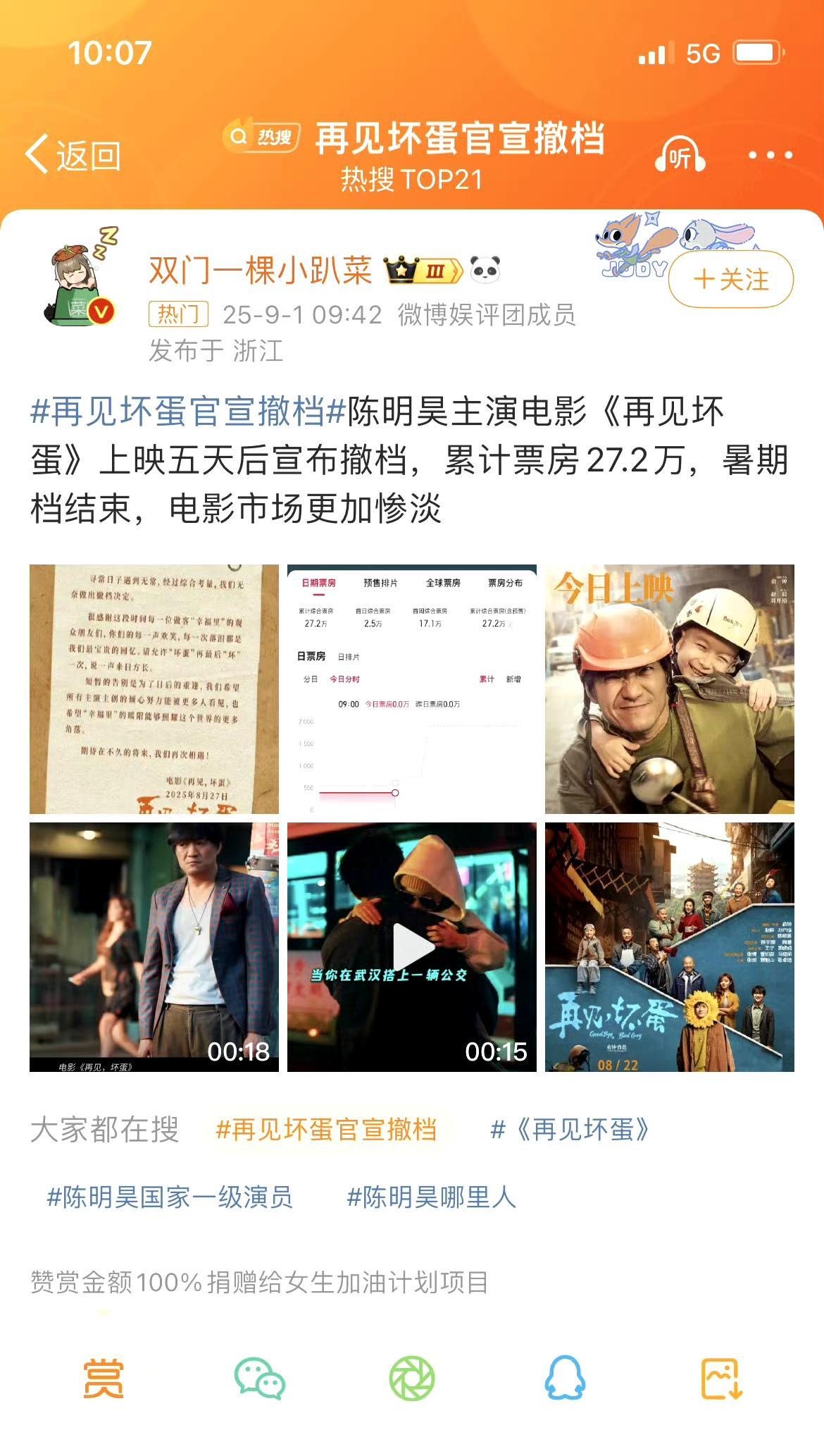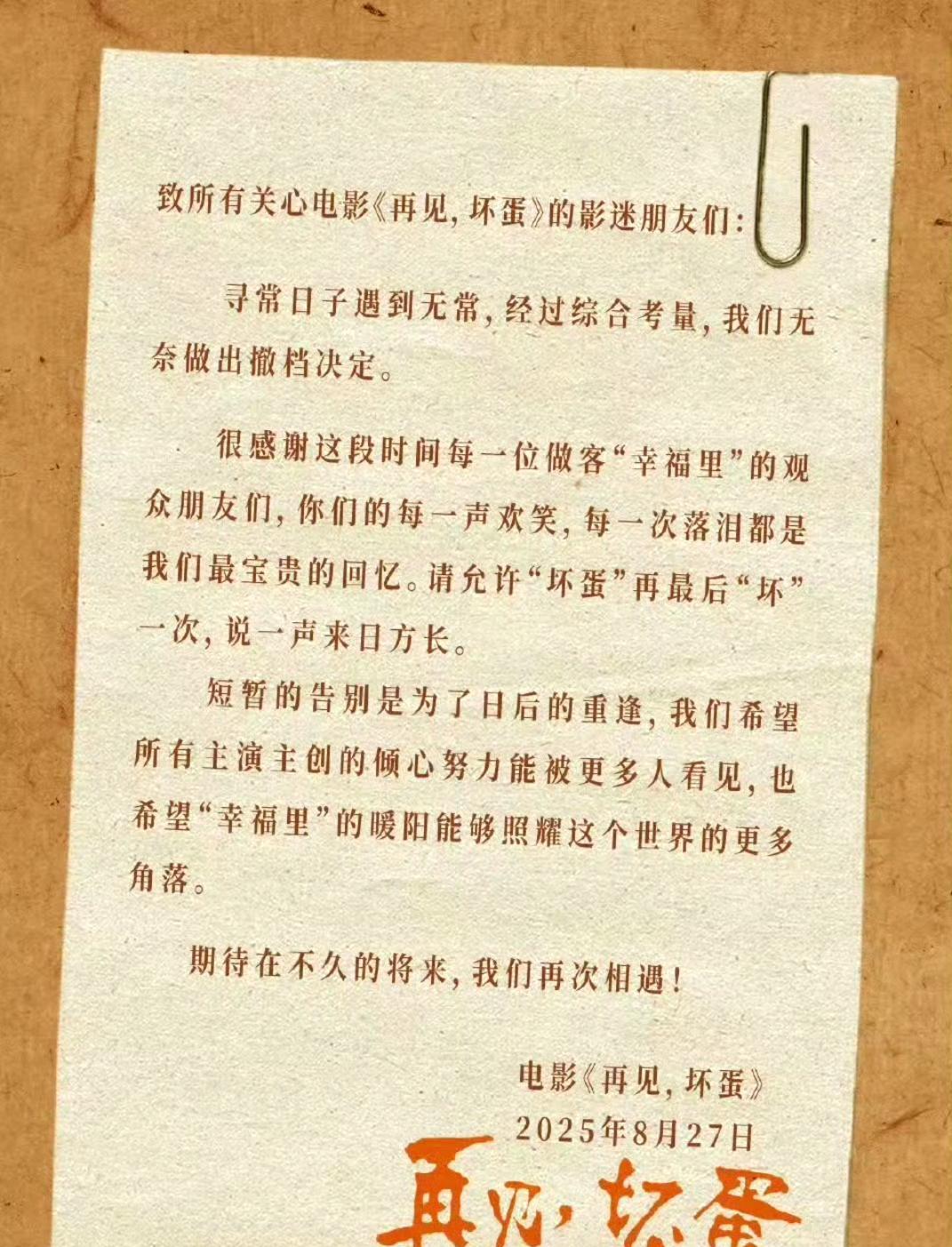 #再见坏蛋官宣撤档#一般来说,不少“三无电影”尚能收获百万票房,而《再见坏蛋》