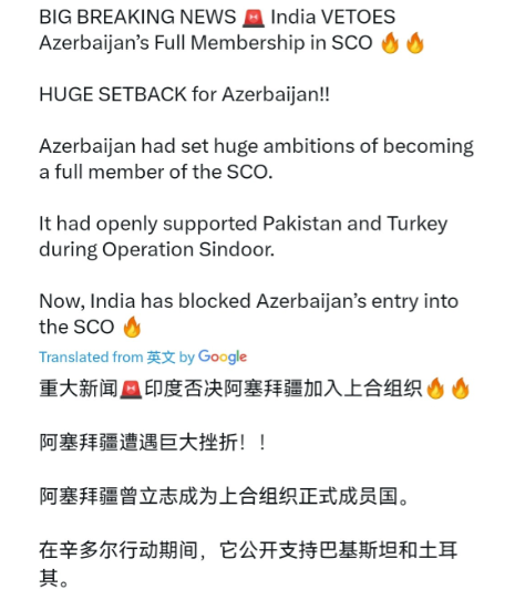 印度动用了否决权!9月1日,印度媒体称,印度否决阿塞拜疆加入上海合作组织。这是阿塞拜疆的巨大挫折!!阿塞拜疆有成为上海合作组织正式成员的巨大野心。但它在辛多尔行动期间公开支持巴基斯坦和土耳其。现在,印度已经阻止阿塞拜疆加入上海合作组织。