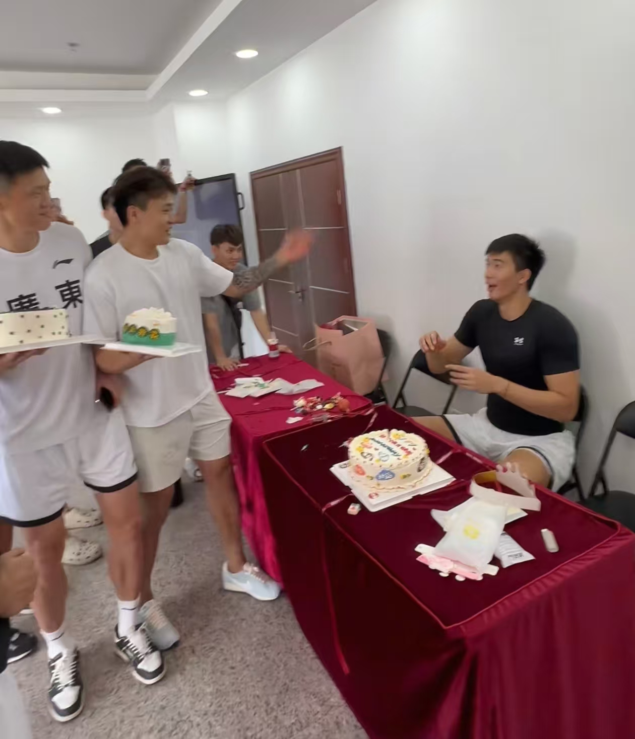 全运会广东男篮今日体测,很多大咖都出现在广东,包括赵睿、周鹏、李炎哲这些其他俱乐部的球员,广东队新援焦泊乔昨日就被拍到已经来到宏远,今日也是跟随全运会的队伍一起,今日恰逢焦泊乔生日,广东也是给他来了一个高级别的欢迎仪式。