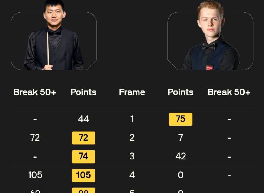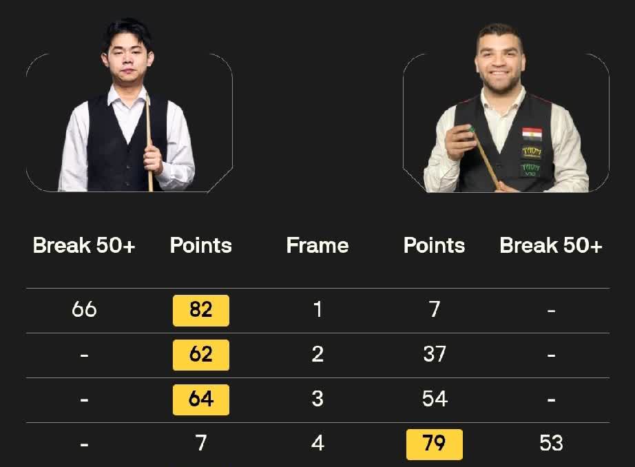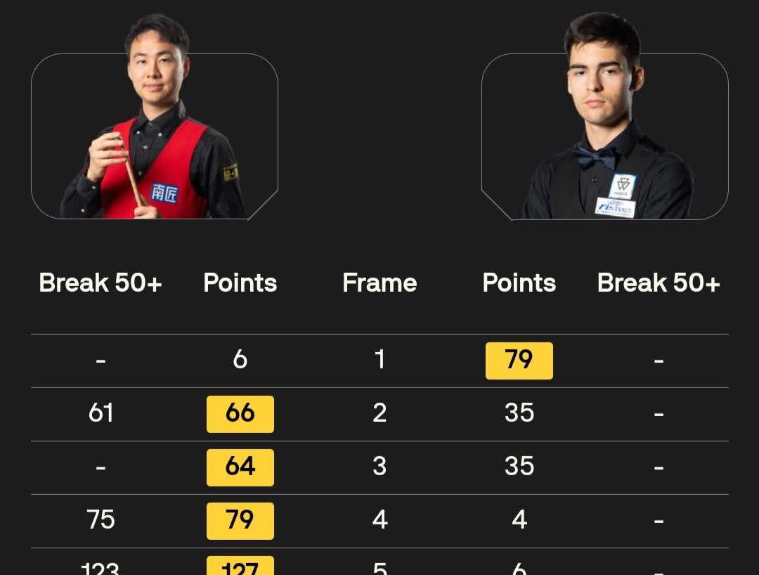 吴宜泽 5-4 弗洛里安·努斯勒 袁思俊 5-1 马哈茂德·哈雷迪 雷佩凡 2-4 路易·希思科特 徐思 5-1 布尔丘·雷维斯 龙泽煌 5-1 阿尔特米·齐津斯 高阳 1-5 奥利弗·莱恩斯 9月1日,斯诺克西安大奖赛资格赛在英国莱斯特开战,9局5胜赛制,胜者晋级正赛。