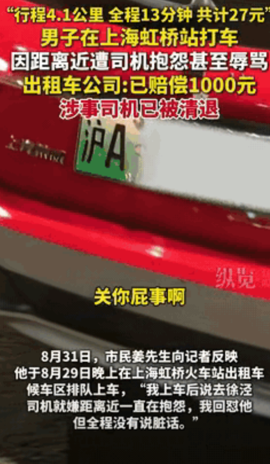 “人狂必遭祸!”上海,一男子在虹桥站打了辆出租,可没成想因为距离近赚钱少,司机就不断抱怨,还和男子吵了起来!等到达目的地后,男子向司机要了发票,谁料二人却因此又发生口角,司机甚至辱骂了男子!气不过的男子将司机投诉,可没想到事情的结果让他很是意外!网友:活该出租车没人坐了! 8月29日晚上,姜先生刚下火车,按照指示牌走到了出租车候客区,随后排队上了一辆正规出租车,他告诉司机要去徐泾,没想到司机一听就不乐意了,一路上不停地抱怨这单生意不划算。