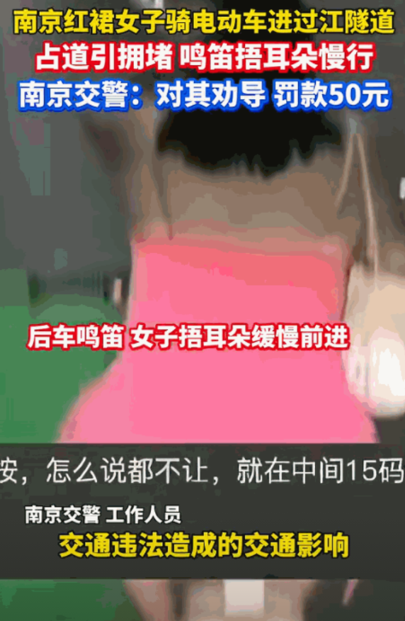 “这个女人火了!”江苏南京,一女子骑着电动车慢悠悠的在隧道内龟速行驶。由于隧道内实线不能变道,导致后方车辆发生拥堵,多名司机狂按喇叭提醒女子让行。结果她竟然直接捂住自己的耳朵“我不听我不听”! 事发隧道中只有两个车道,并且还是单向通行的,大家都知道,机动车在隧道里都是按规定速度平稳开的,可这女子的电动车一直开得特别慢,还偏偏走在机动车道正中间,把一条车道的主要通行位置都占了。 随着女子慢慢往前骑,后面原本顺顺当当开的机动车很快就被堵住了。 一开始后面的车还想保持安全距离慢慢跟着,可电动车和机动车的速度差实在太大,才几分钟的功夫,隧道里就堵起来了。 后面排队的车从一开始的两三辆,很快就变成了十多辆,车和车之间的距离越靠越近。 有些司机想快点过去,就开始频繁轻点刹车,隧道里的刹车灯一个接一个亮起来,原本顺畅的车流彻底乱了套。 更让后面司机觉得无奈的是,面对堵车的情况和身后不停响的喇叭声,这女子不光没加快速度,也没往边上靠让一让,反而抬手捂住了左耳。 最后因为这女子就只是有电动车进隧道这一个违法行为,所以交警部门先对她进行了劝导,之后依法罚了她50块钱。 有一部分网友觉得,这女子太没交通安全意识了,不光把自己置于危险之中,还搅乱了公共交通秩序,罚她款是应该的,50块钱能让她长长记性。 还有网友说,从她这种行为能看出来,有些人根本不把交通规则当回事,必须得加强交通安全教育,让大家都更懂交通法规,也更愿意遵守。 不过也有另一部分网友对50块钱的罚款有疑问,他们觉得这女子造成的堵车情况不算轻,50块钱的罚款是不是太轻了,可能起不到足够的警示作用,应该罚得更重一点,这样才能让其他人也吸取教训,不敢随便违反规则。 道路交通安全法早就明确规定了,非机动车不能进专门给机动车走的道路,这么规定就是为了保证道路安全、通行顺畅,减少不同类型车辆混在一起走可能带来的危险。 电动车进隧道一方面是速度慢,另一方面是防护不如机动车,真出了事故,骑车人十有八九会伤得很重;而且还容易造成堵车,影响其他车辆正常出行。 大家都要把交通规则放在心上,打心底里敬畏规则,自觉遵守,一起把道路交通环境维护得更安全、更有秩序、更顺畅。 只有每个人都有交通安全意识,大家出门走路、开车才能更放心、更顺利。