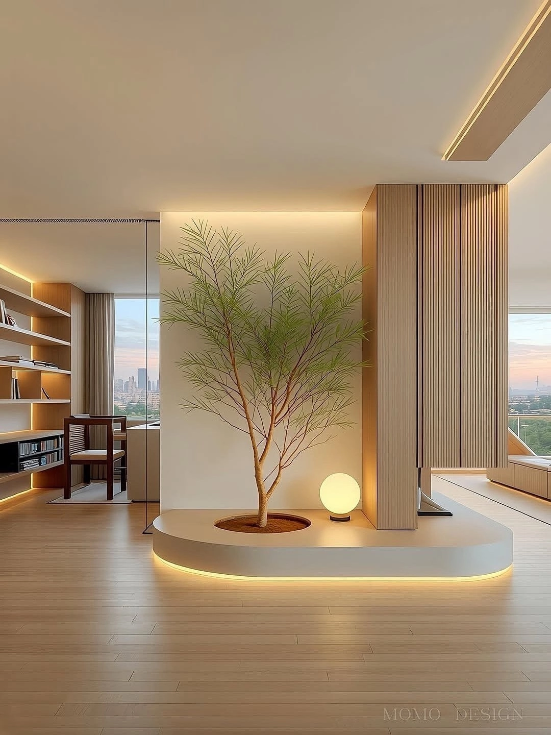七个空间,一镜到底的无障碍玄关,只用三分美,自带清风叩心门的意境,没柜子无玻璃,让近处的树,成为大平层里最雅致的景,最天然的玄关!