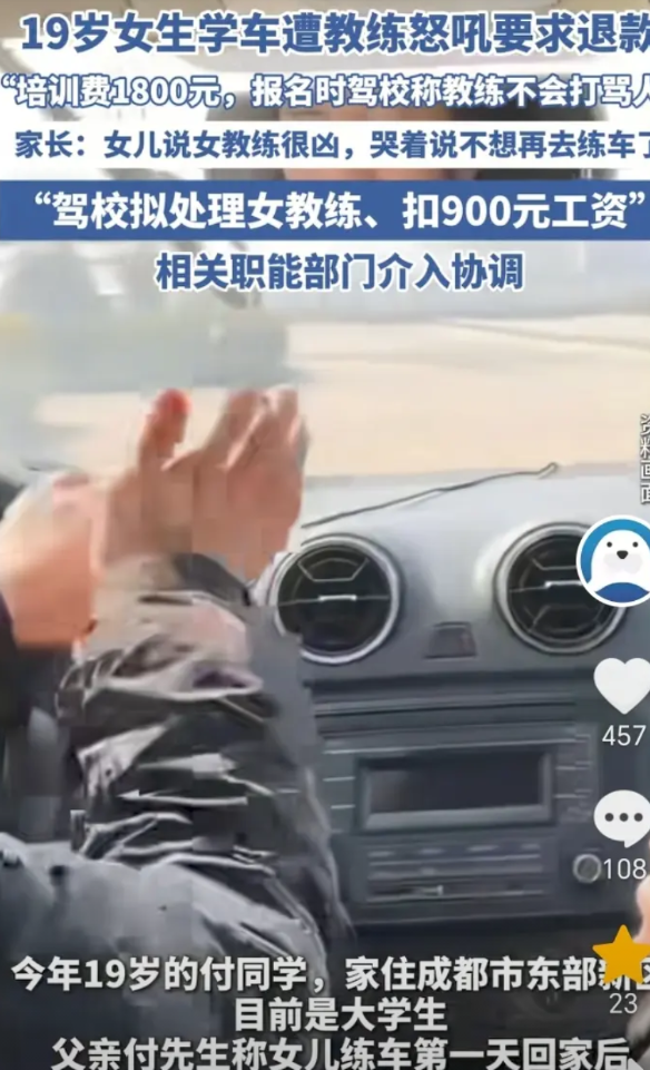“巨婴”!成都,19岁的女大学生花费1800元去练车,练了一天,回家后就哭着说不想去了,原来是女子在练车时被教练给骂了,她觉得教练很凶就不想去了。驾校承认了教练态度不好,同意给换一个教练,双方协商未果,驾校疑似处理了教练扣了900元工资,目前,相关职能部门介入协调。