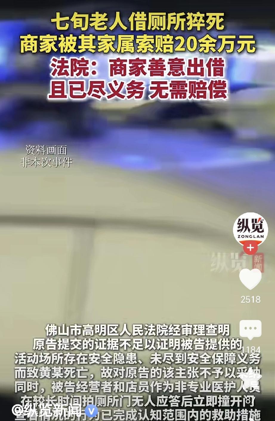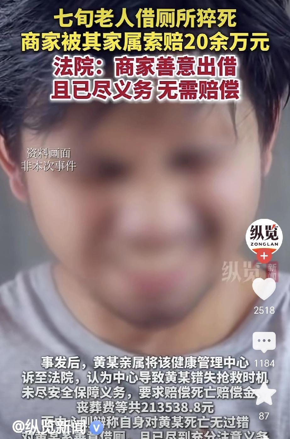 广东佛山,一70岁大爷路过健康管理中心,他想解手,进去借用厕所,店员看他着急,好心让他使用,谁知大爷进去,很久不见出来,店员敲不开门,立刻拨打120急救,老板和店员撞开了门,发现大爷躺在地上,喊他没有回应,医生赶到后确认,大爷已经没救,经法医鉴定,大爷是猝死,可家属认为,是商家延误抢救,这才导致了大爷死亡,家属告到法院,索赔21万,法院这样判了! 黄某已经70岁的年纪,他年纪大了,啥也不需要干,他没事遛弯,常在四周溜达转悠。 2024年8月27日,黄某吃饱喝足,他揣上点零钱,想走的远点,附近这一片的地形,他已经太熟悉了,他要去外面更热闹的地方转转。 他来到街上,果不其然,这里一家两行,满满都是店铺,有大超市,也有小商店,有小餐馆,也有大酒店。 路上行人匆匆,各人办着各人事情,黄某走走停停,一边溜达,突然看到街边有一家健康管理中心。 黄某径直走了进去,原来,黄某想上厕所,他一路憋着,四处张望,可看了半天,也没见有公共厕所。 他有些着急,一般小店没有厕所,超市商场里太大,他进去分不清方向。 这样一来,最好的地方就是这家健康管理中心,店面看起来不小,里面肯定能上厕所。 黄某推门进去,看见一位店员,急忙说明着急上厕所,店员好心,点头答应,告诉他厕所位置,黄某感激,急急火火走了进去。 他进去之后,把门反锁,憋了半天,赶忙解决方便问题,谁知他突然眼前发黑,一下摔倒,厕所处隐蔽,外面没人听到动静。 店员谢某来到厕所,他发现一间厕所门反锁,敲了几下,没人答应。 店里的厕所,如果没人,不会关门反锁, 谢某有点诧异,又拍了一阵,里面始终没见动静。 谢某急了,立刻叫来老板马某,俩人继续拍门,还是不见任何动静。 老板怕里面有客人出事,急忙拨打了120急救电话,打完之后,谢某马某撞开了大门。 俩人进去一看,黄某在地上躺着,一动不动,俩人大声喊他,黄某依旧双眼紧闭。 急救车呼啸而来,医护人员赶到现场,医生对黄某做了检查,发现黄某没了生命特征。 经过鉴定,黄某是自身疾病导致的猝死,家属接到了通知,急匆匆赶来,他们一看,黄某死亡,立刻大闹,和健康管理中心没完。 他们认为,黄某之所以死亡,是因为店里拖延了较长时间,未尽到安全保障义务,因此才导致了黄某猝死,没能抢救回来。 因此,家属告上法院,要求健康中心赔偿他们213538.8元。 健康管理中心大呼冤枉,是黄某自己跑来要借厕所使用,店里出于善意,看他着急,这才把厕所借给他用,谁也没有料到会出这样的事情。 并且,在店员发现厕所门打不开之后,和老板一起打120电话前来救治,同时,他们撞开了厕所门,发现黄某已经躺在地上。 何况,经过医生鉴定,黄某是自身疾病引起的猝死,和其他人没任何关系。 因此,管理中心认为,店里对黄某已经尽到充分注意义务,对黄某的死亡并无过错。 因此,健康管理中心要求法院驳回黄某家属的诉讼请求。 那么,这件事在法律上是怎么认定的呢? 《民法典》第1198条规定: 公共场所的经营者、管理者需对进入场所的人员承担安全保障义务,但该义务以“合理限度”为边界,不包括对不可预见的突发疾病导致的损害承担责任。 本案中,健康管理中心作为开放场所,向黄某无偿出借厕所属于善意行为。 店员在发现厕所反锁后持续敲门、并及时拨打120并破门施救,这已超出普通人对无偿借用场景的合理预期。 如果家属要求非医疗机构的商家配备急救设备或预判猝死风险,明显超出合理的限度。 《民法典》第1165条规定: 主张侵 权赔偿需要证明行为与损害结果之间存在因果关系。 本案中,黄某的死亡原因为猝死,是他自身疾病引发,法医鉴定及现场勘查时均未发现厕所存在安全隐患。 商家也在发现后及时拨打了急救电话,未有延误抢救行为。 家属主张延误抢救,但未能举证证明是因商家过错导致救治时间被不当延长,因此认定,因果关系不成立。 《最高院关于适用〈民事诉讼法〉的解释》第90条要求,当事人对自己主张的事实负有举证责任。 本案中,家属需同时证明两点:一是商家未尽安全保障义务,如厕所设施不安全或救助不及时;二是该过失与黄某死亡存在因果关系。 而家属没有证据证明厕所设施有问题,或商家存在主观拖延。 相反,商家的施救记录,如120通话时间、破门时间,证明商家在发现问题时已经积极履行了救助义务。 根据“谁主张谁举证”原则,原告举证不足,家属的要求并不合理。 民法典鼓励社会互助,商家无偿提供厕所属于善意。 猝死具有突发性和不可预见性,安全保障义务不能无限扩张,否则将不合理加重普通经营者的负担。 因此,法院认为,健康管理中心是出于善心,无偿提供厕所使用,不应承担过重责任。 法院驳回黄某家属诉讼请求,家属不服,提起上诉,二审法院维持原判。 对此,你怎么看? @王哥说法 #头号创作者激励计划#