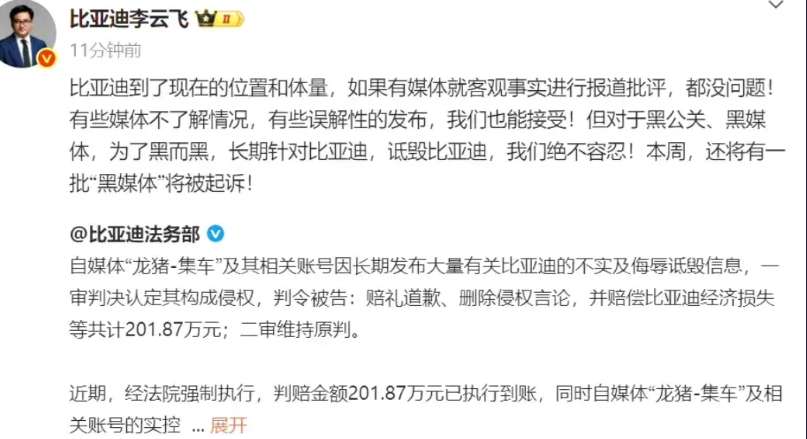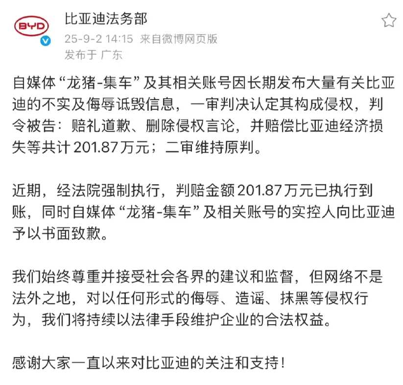 汽车自媒体侵权受到的有史记载最高金额处罚201.87万! 9月2日,比亚迪法务官方账号, 公布自媒体“龙猪-集车”侵权诋毁比亚迪案件的二审结果, 1、赔礼道歉,删除不实信息, 2、赔偿经济损失201.87万, 3、二审维持原判 看到法院强制执行,已经到账了, 不得不感叹,自媒体真赚钱! 你怎么看?