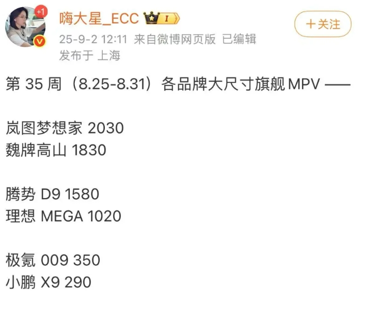 魏牌这次新高山7/8/9确实很成功,上周(2025.08.25-2025.08.31)魏牌高山销量为1830,等高山7上市之后,估计还能更高。
