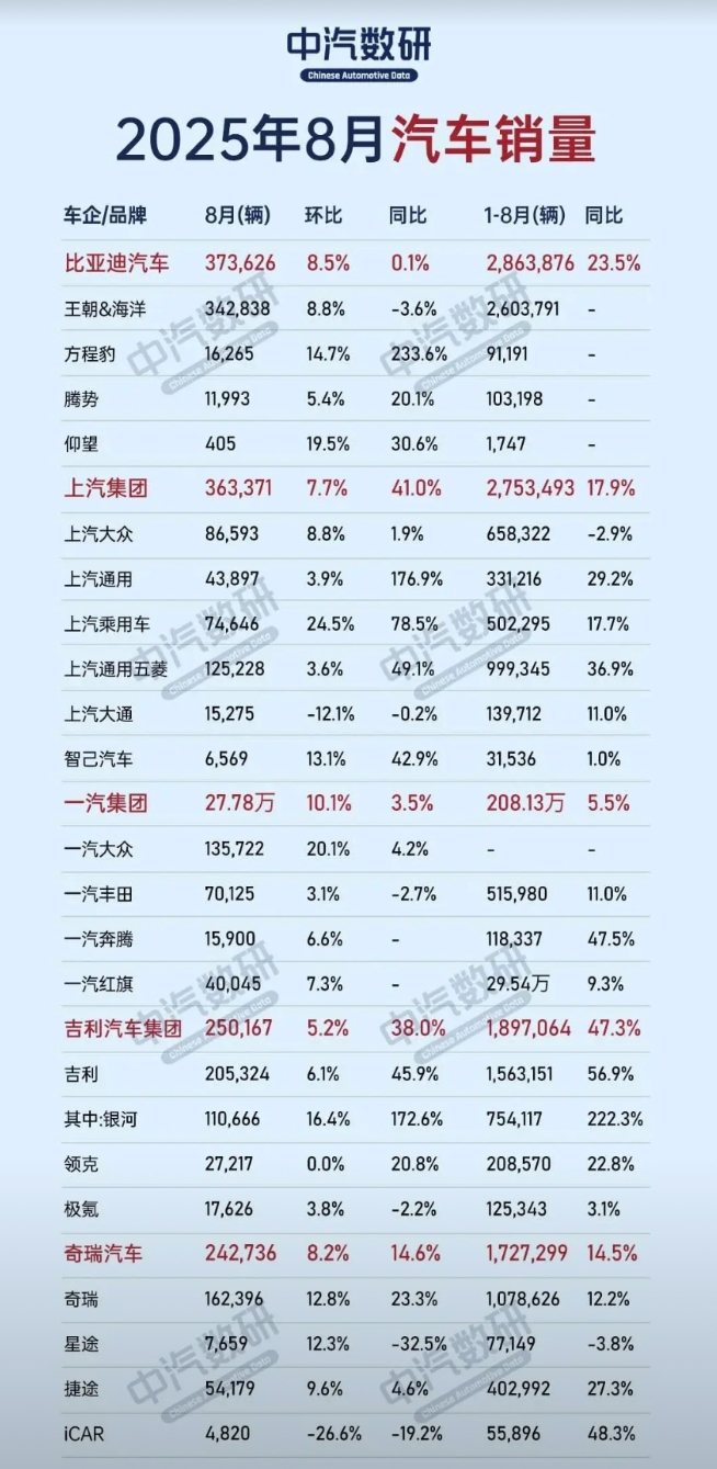 8月车企销量榜出炉。 1.比亚迪:37.3万辆; 2.上汽:36.3万辆; 3.一汽:27.78万辆; 4.吉利:25万辆; 5.奇瑞:24.2万辆; 6.长安:23.3万辆; 7.北汽:13.6万辆; 8.东风:未公布; 9.广汽:未公布; 10.长城:11.5万辆; 11.零跑:5.7万辆; 12.鸿蒙智行:4.4万辆; 13.小鹏:3.7万辆; 14.蔚来:3.1万辆; 15.小米:30000+; 16.理想:2.8万辆。